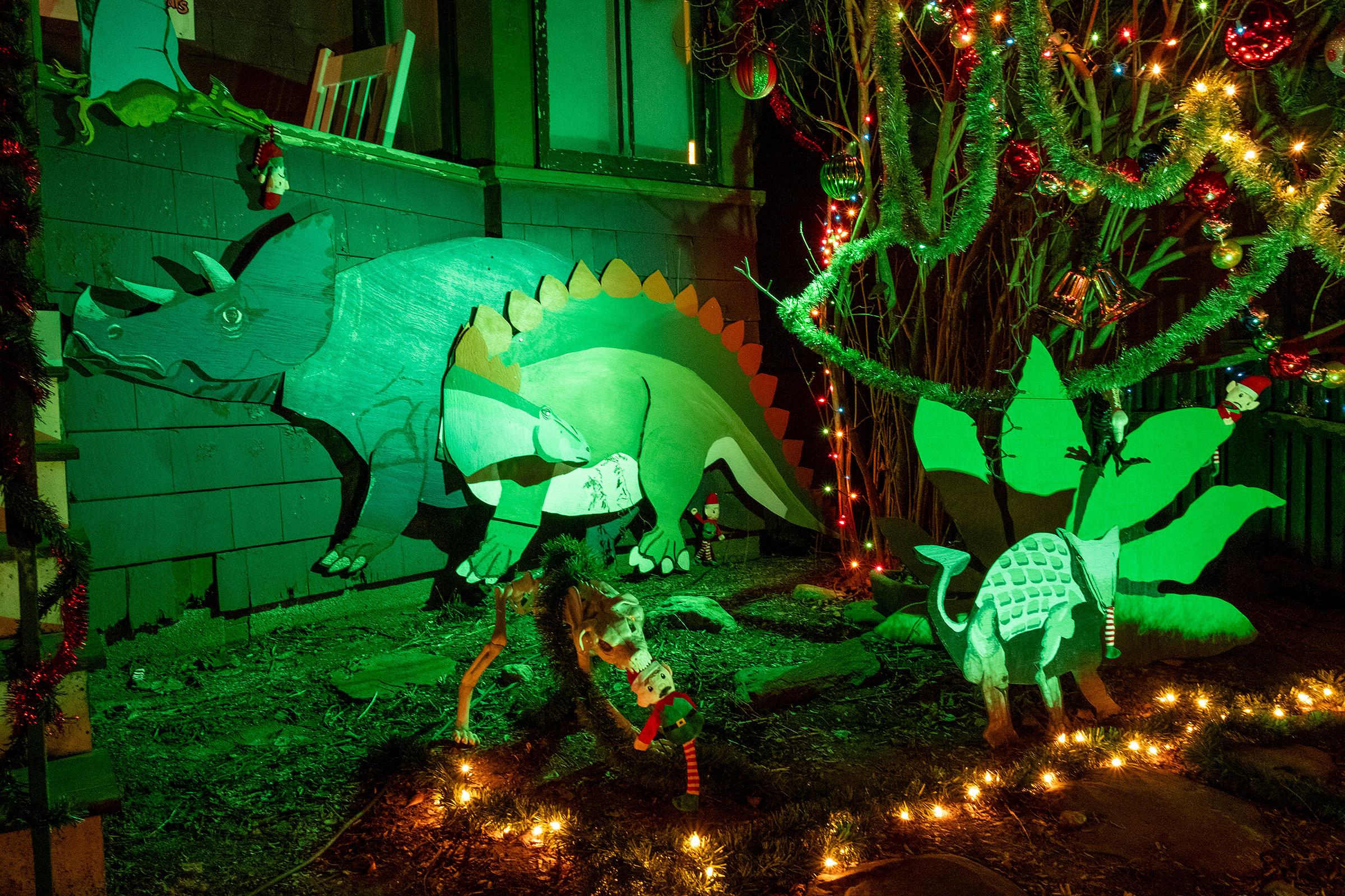 How many different ways can you decorate your yard for the holidays? You might opt for the classy, minimal look with classic winter colors. You might choose a whimsical aesthetic with bright and multicolored lights, or you might prefer an over-the-top look with giant inflatables. Or, if you’re 61 Putnum St. in Somerville, you might decide to create a portal to a prehistoric hellscape featuring a T‑Rex nativity and elves being torn to shreds by the skeletons of demon hellhounds while a raptor skeleton in a Santa hat flies overhead.