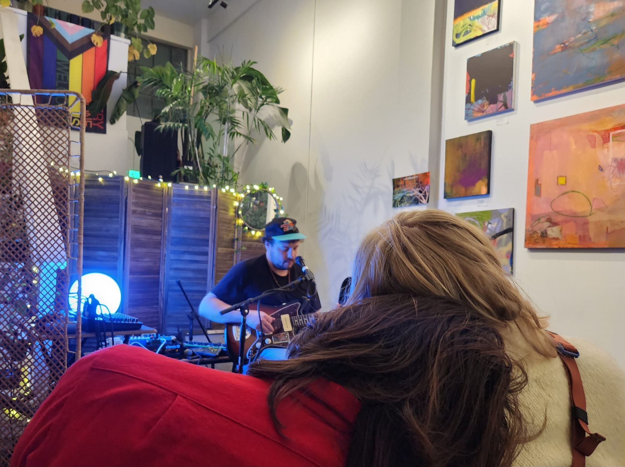 I’d arrived uninitiated to any of the artists or their styles, tempted enough by the name of a coast I like and the prospect of a low-stakes, seated and warm show. I was greeted by friendly faces, ample seating for the small crowd, and gentle bluesy, indie folk twinkling away from some speakers. Small clusters of attendees—or are they the artists?—bowed their heads towards one another, deep in conversation. One was about CBD.