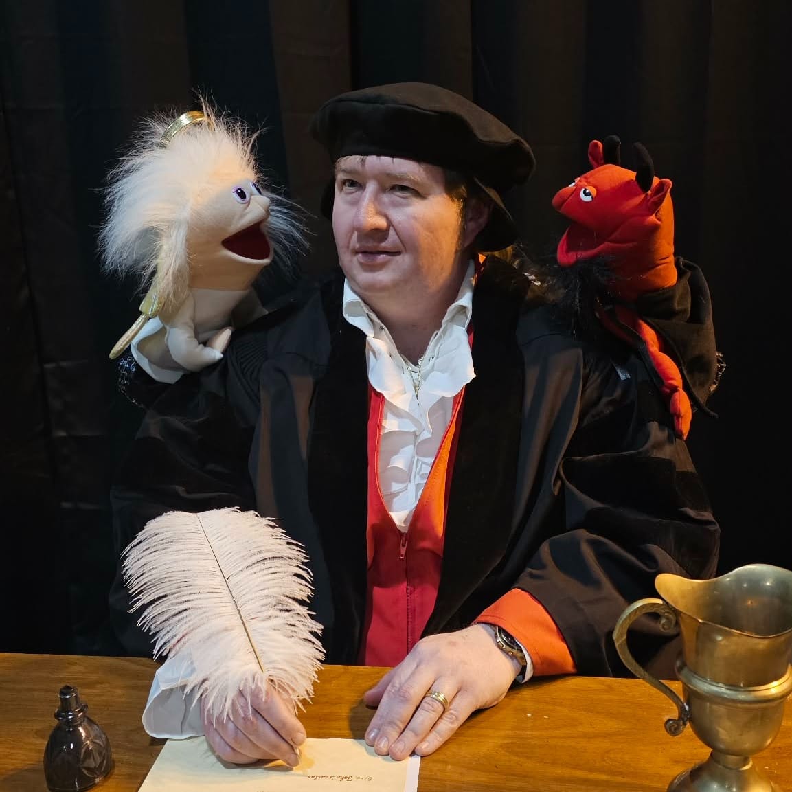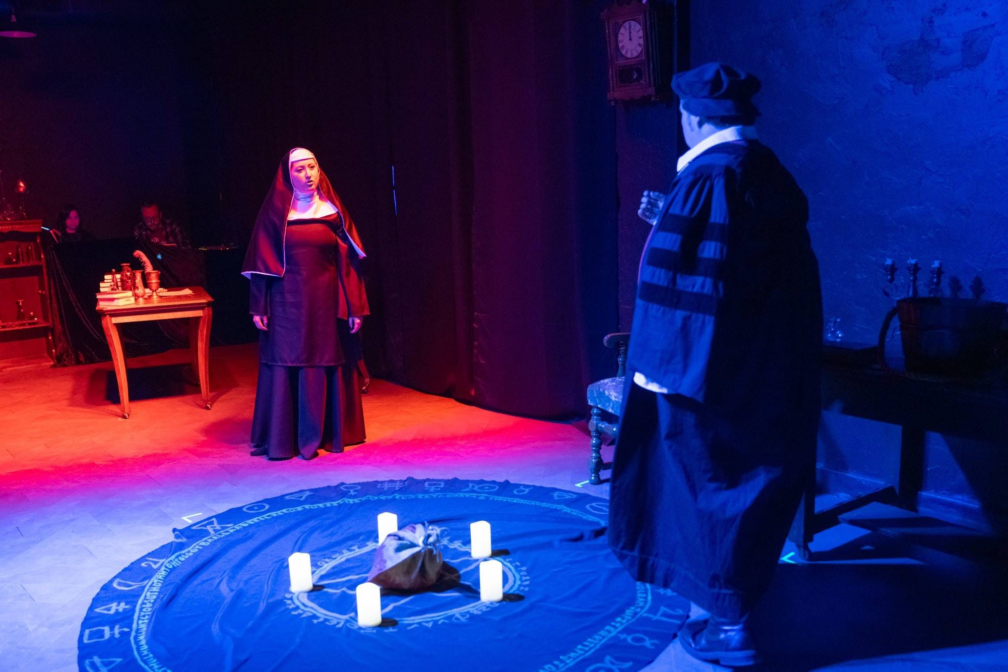 Underneath Doctor Faustus’ theatrical flair—the playful costumes, the glow-in-the-dark pentagrams, and, yes, the puppets—is a message about ambition. When Marlowe wrote the play, it was impossible to extract this message from its religious context, but I find a secular warning in this production that feels more universal: one about the dangers of selfish individualism. It’s not Faustus’ academic background that marks him as an antihero. It’s his conclusion that, because of his advanced knowledge, he is better than the world. When we lose our empathy, the play seems to argue, we lose our humanity.