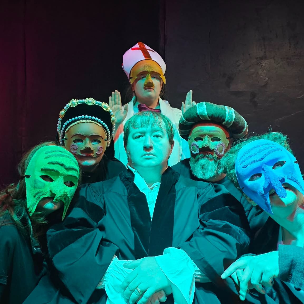 Johnson also brought in elements of commedia dell’arte, an early form of comedic Italian theatre that used masks to invoke different stock characters. While I loved the thematic decision to use commedia to highlight the idea of the seven deadly sins wearing masks to hide their identity and further entice and entrap Faustus, I wanted the actors to embrace the attributes of the stock characters even more.