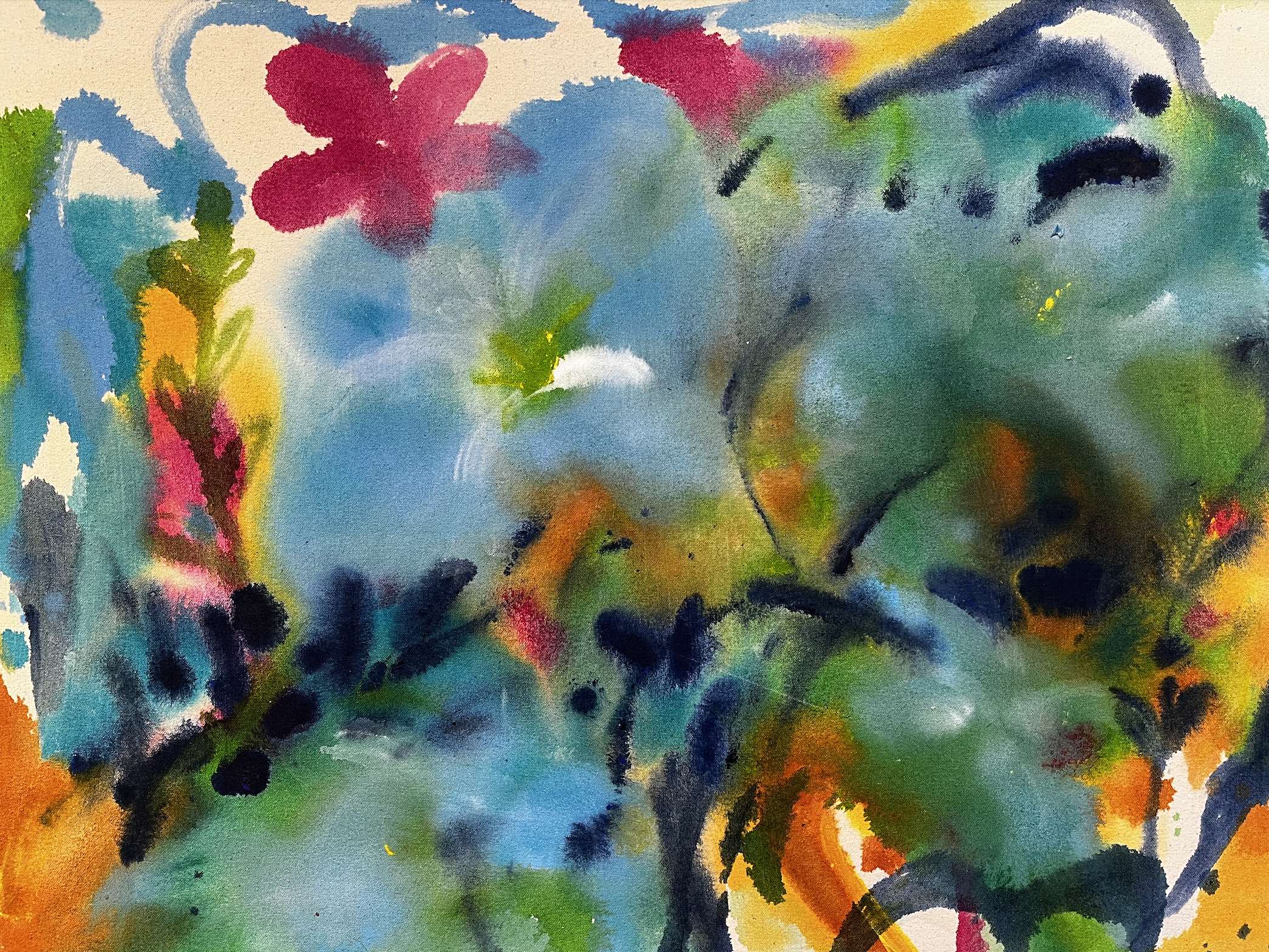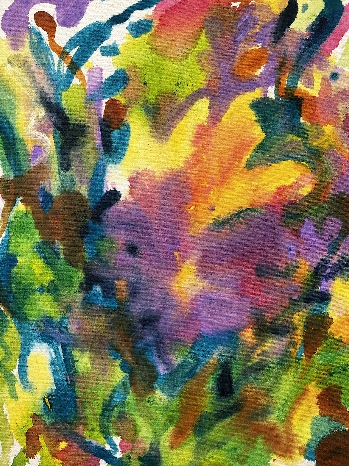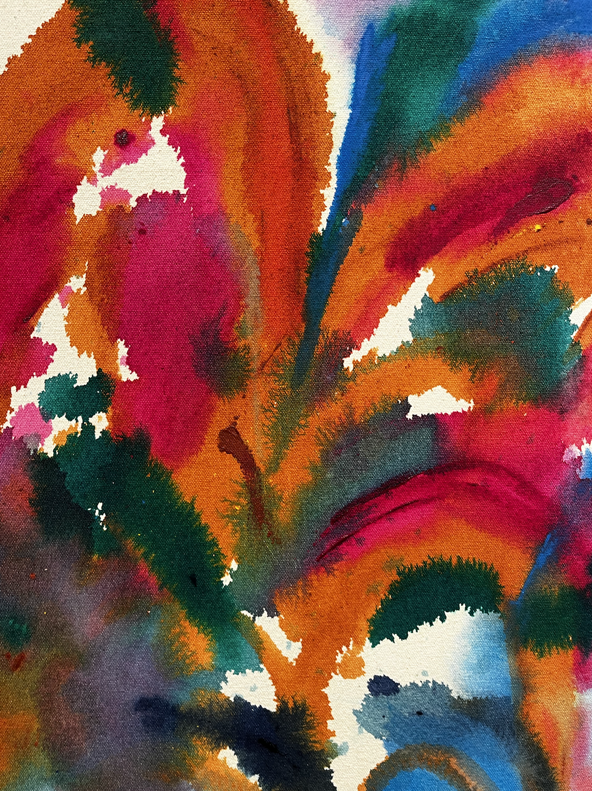 Zang's piece “Halcyon Cumulonimbus” is a modern lesson on old-school technique. Also known as “anvil clouds,” cumulonimbi are the perfect subjects for fauvist paintings. They’re characterized by their flat tops and signify oncoming thunder; but through typical fauvist fashion, Zang erases the usual grey ambiguity of cloud formations and understands their dynamism instead through vibrant pigment and simple lines. She follows Helen Frankenthaler’s 1950 soak-stain approach to transform acrylic into a high-fluid ink that more closely resembles watercolor, rendering approaching uproar into soft splashes of cobalt and wine. Patches of peach pastel provide a semblance of hope in the face of the storm.