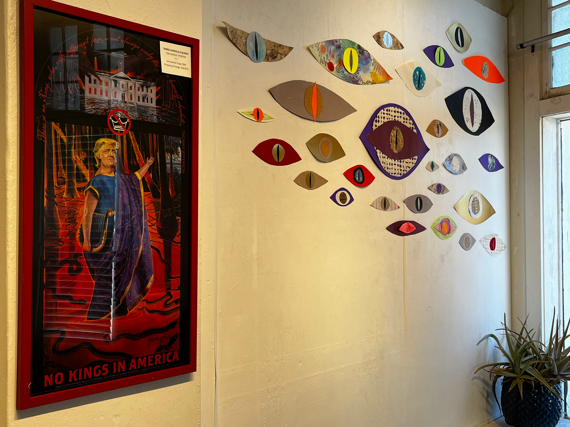 White plays with the form of the lens in every piece, picking up its shape in crescents and leaves and clouds, suggesting expressions of vulnerability or protection: a slice of something that you can peek around, a cupped place to rest, an arc overhead. But she doesn’t leap to obvious analogues (like, say, a literal umbrella); she stays with the lens as its wide-ranging self, urging the viewer to make their own associations, to see more through something simple, enjoying its abstraction as well as its reality. One exception is a striking wall of eyes just to the right of the gallery entrance. On the day I visited, a “No Kings” poster stood beside these eyes in preparation for a talk about protest art, and I appreciated their watchfulness, their urgent message to keep looking.
