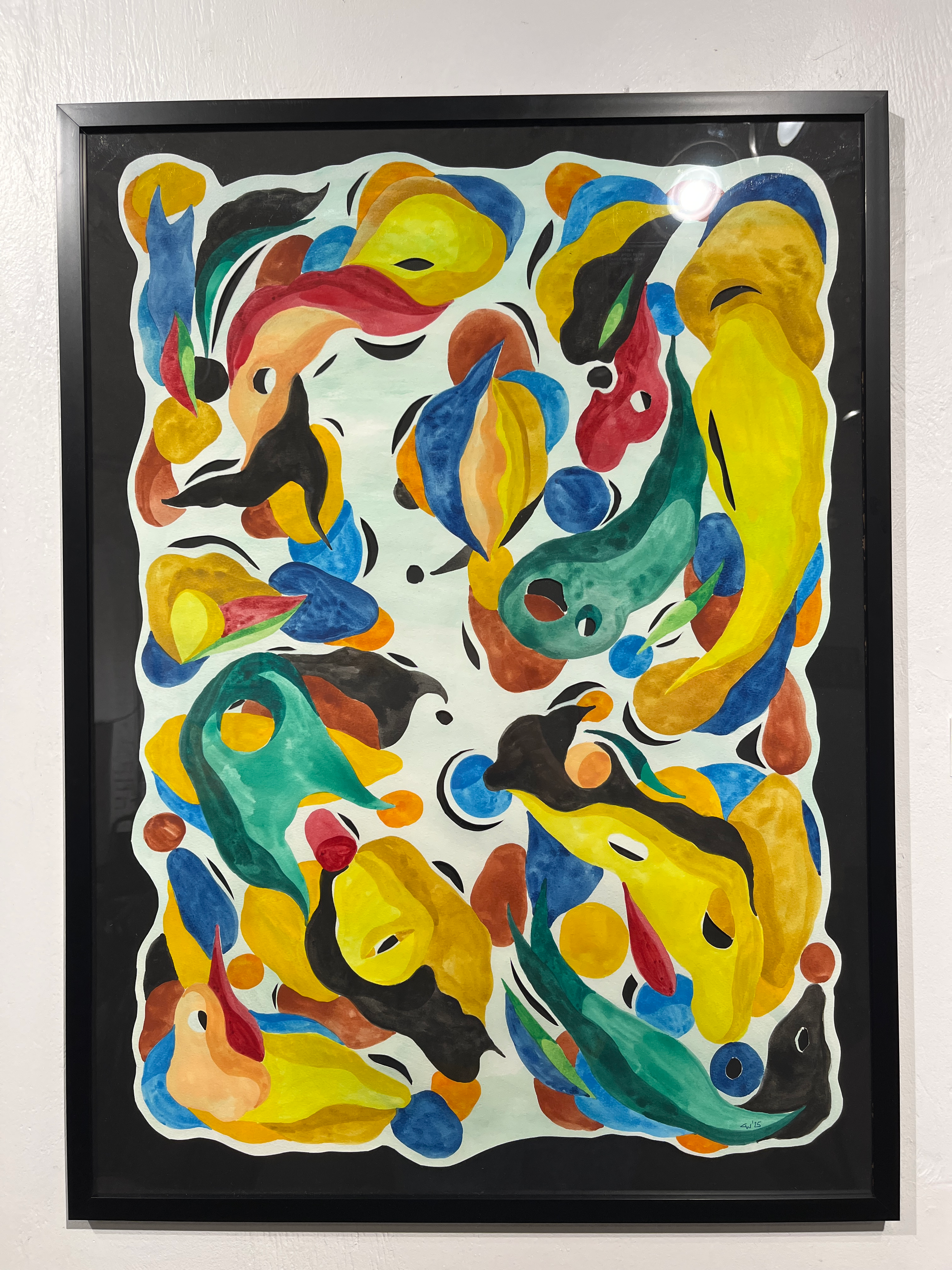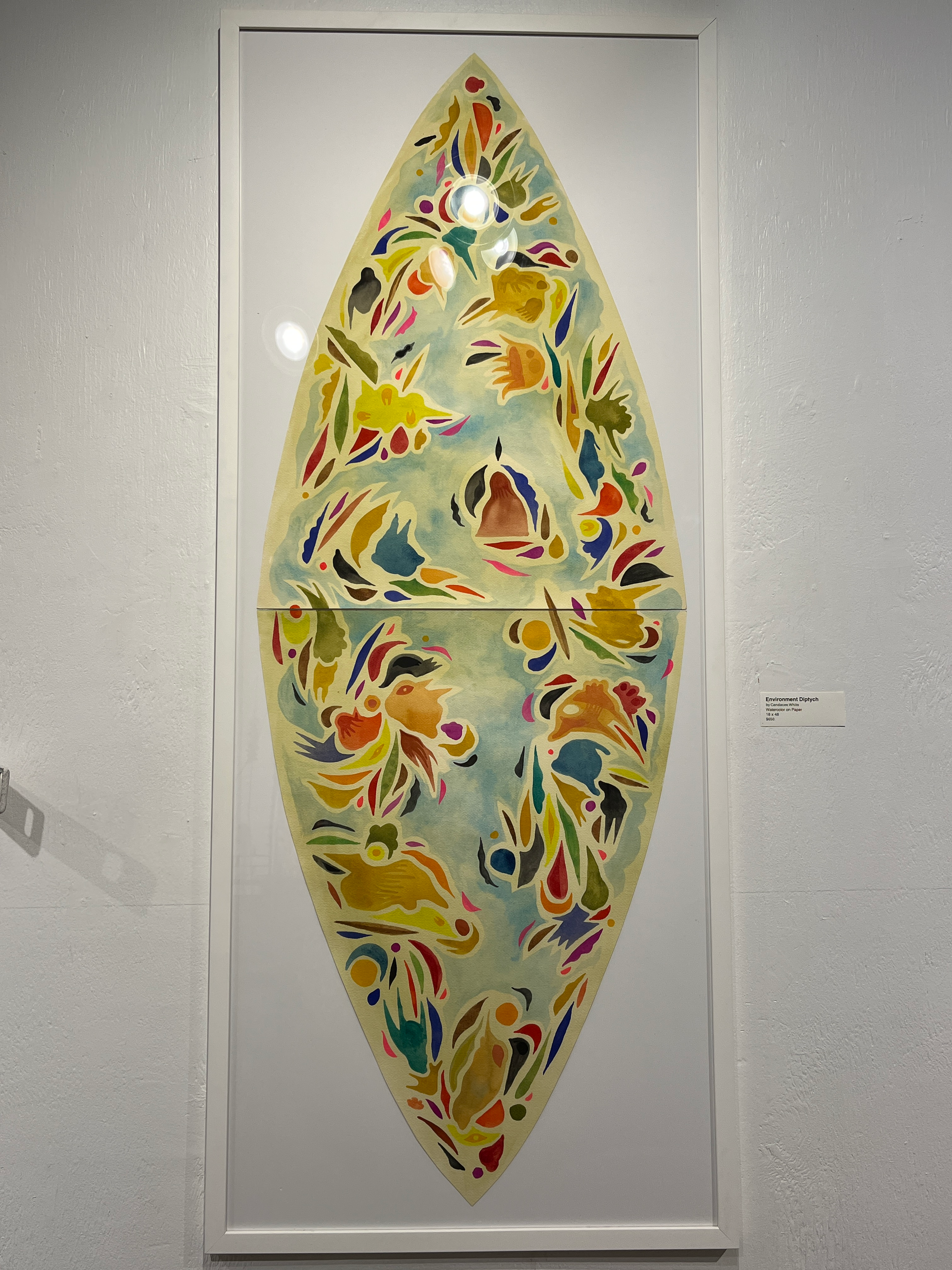 In a series of pieces she calls “environments,” she uses watercolors to soften the clean lines of the lens shape into blobs and corpuscles, gathered in an oozing bloom like what you might see looking at a drop from a tide pool through a microscope. My favorite of these watercolors, hung vertically, evokes an entrance to a cave, or perhaps a kayak, a shield, or the pupil of a cat's eye.