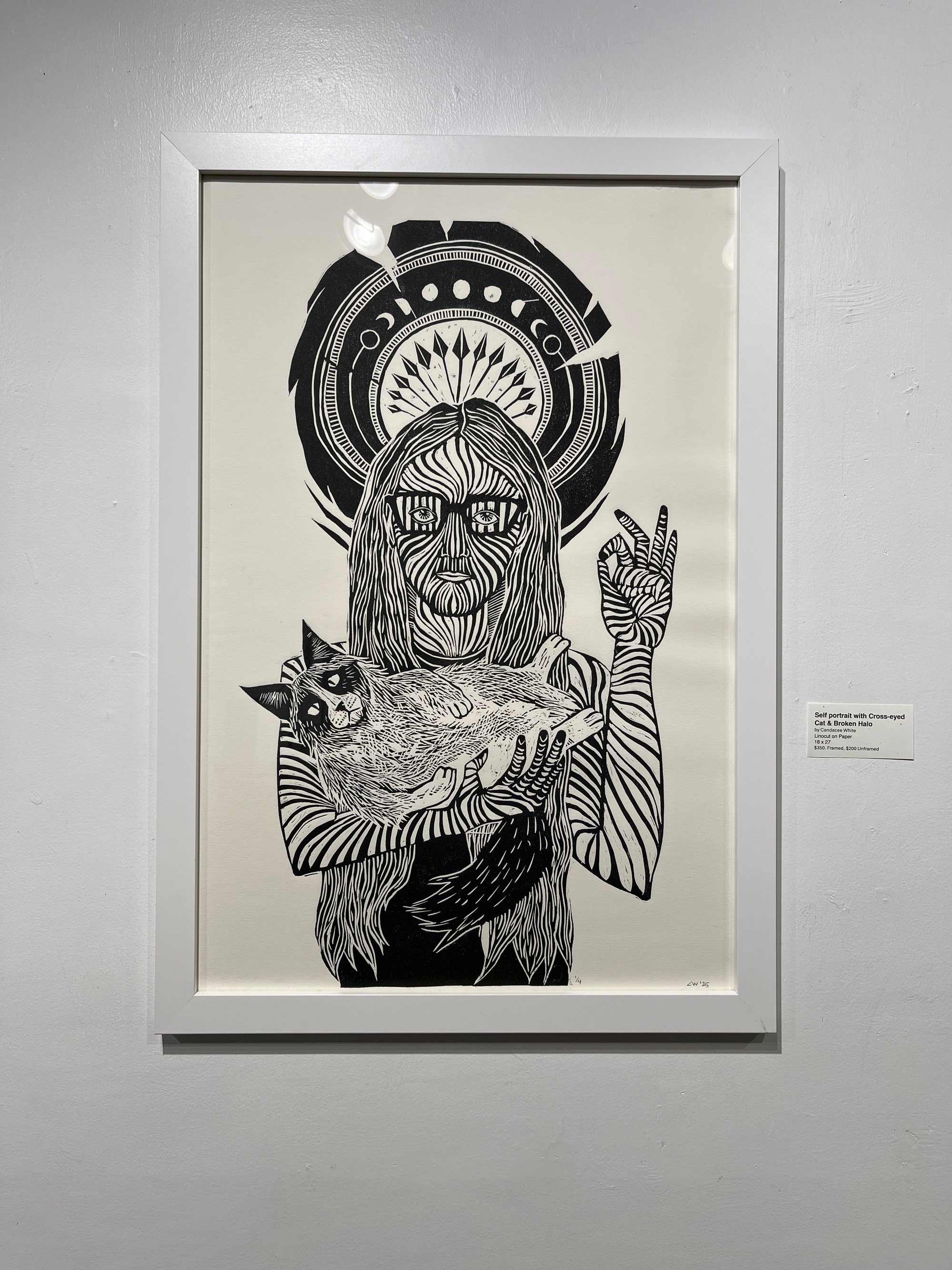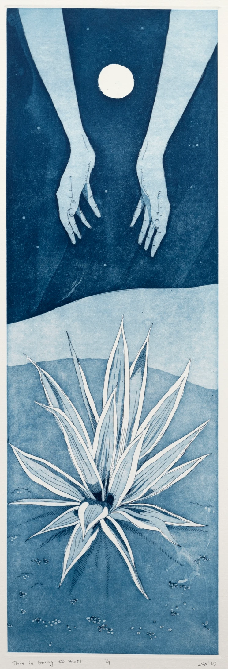 Self-portraits and human forms recur throughout the show. In one, a broken halo of arrows and moon phases frames the head of the artist, holding a cross-eyed cat in one arm; in another, moonlit hands prepare to dive into a yucca plant whose leaves reach up as the fingers reach down. Referencing both iconography and evolution, these pieces make for moving interludes, prompting more personal reflection. Are we simply who we are, or are we a series of traces of change, a form through which a mysterious life force shifts and refracts? As I looked at White’s exquisite woodcuts and linocuts, I thought of the physical action that these mediums involve—carving, scooping, rolling, pressing down, peeling away—and how the relief image itself appears in the “empty” spaces, where the ink isn’t, like the image that appears when two circles intersect.