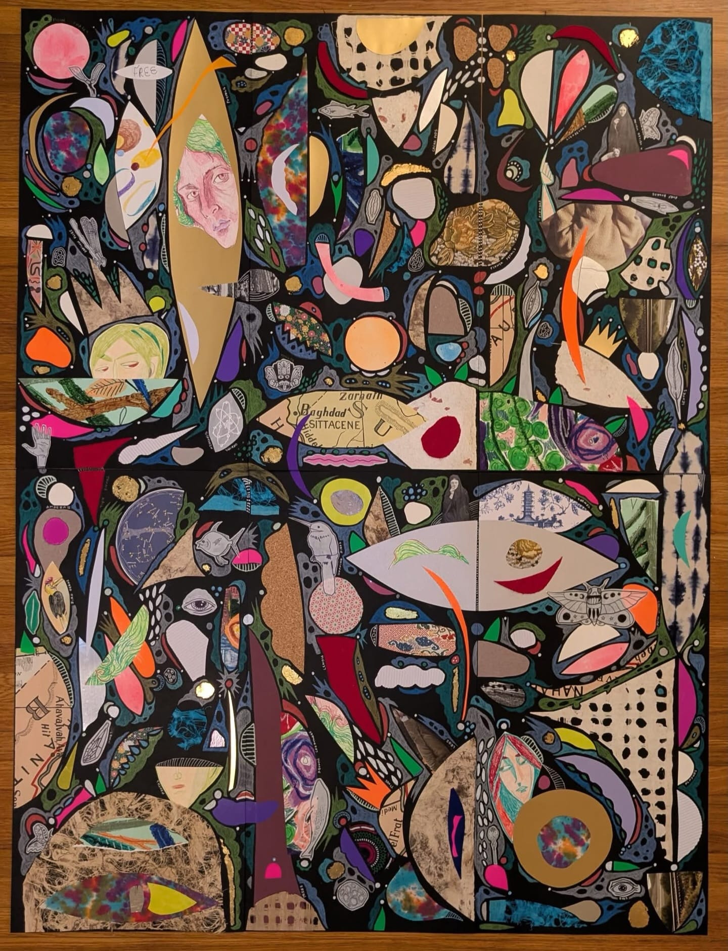 Intricate handmade collages draw from White’s extensive world travels to create environments with a totally different feel, conjuring the speed and noise of civilization—almost a visual anthropology. Scraps of images, colors, and words meet and overlap, murmuring in many tongues through time and space, suggesting unexpected connections and delivering dozens of tiny pleasures as my eye traveled through the profusion.