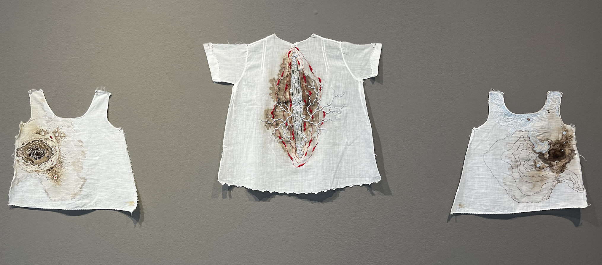 Erin Daniels puts ripped jeans to shame in her collections “Garden of the Soul” and “Healing Sutra,” currently showing inside the alumni gallery of Moore College of Art and Design. Daniels’ designs aren’t made to wear, but are rather made of already-worn fabric. The result is a series of tiny garments, bruised and stained with age, and made textile artworks by the hands of their inheritor.