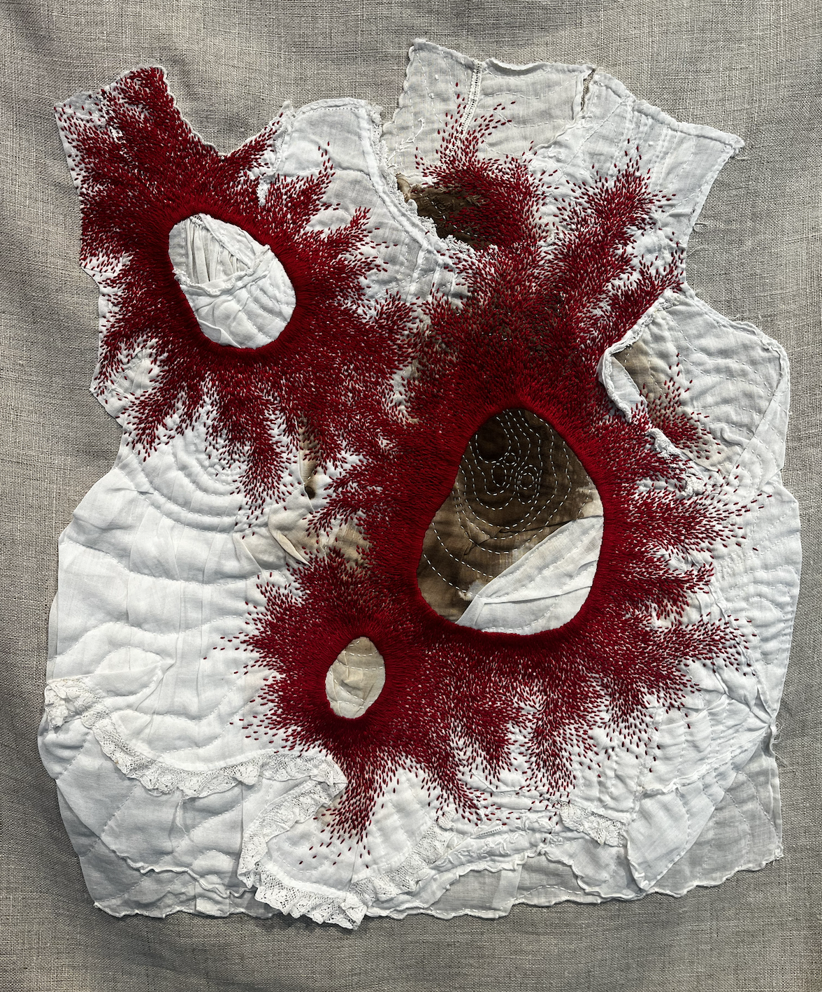 Browned patches are decorated with red threading that resembles blood, suggesting a violent rebirthing through the intensive procedure of embroidery. Other stains are surrounded by delicate line work that look like topographic mapping. Though we’re not told the stories of these clothes — who they belonged to, by whom they were originally sewn, or how long they’ve lasted — a deep sense of curiosity is peaked through their presentation.