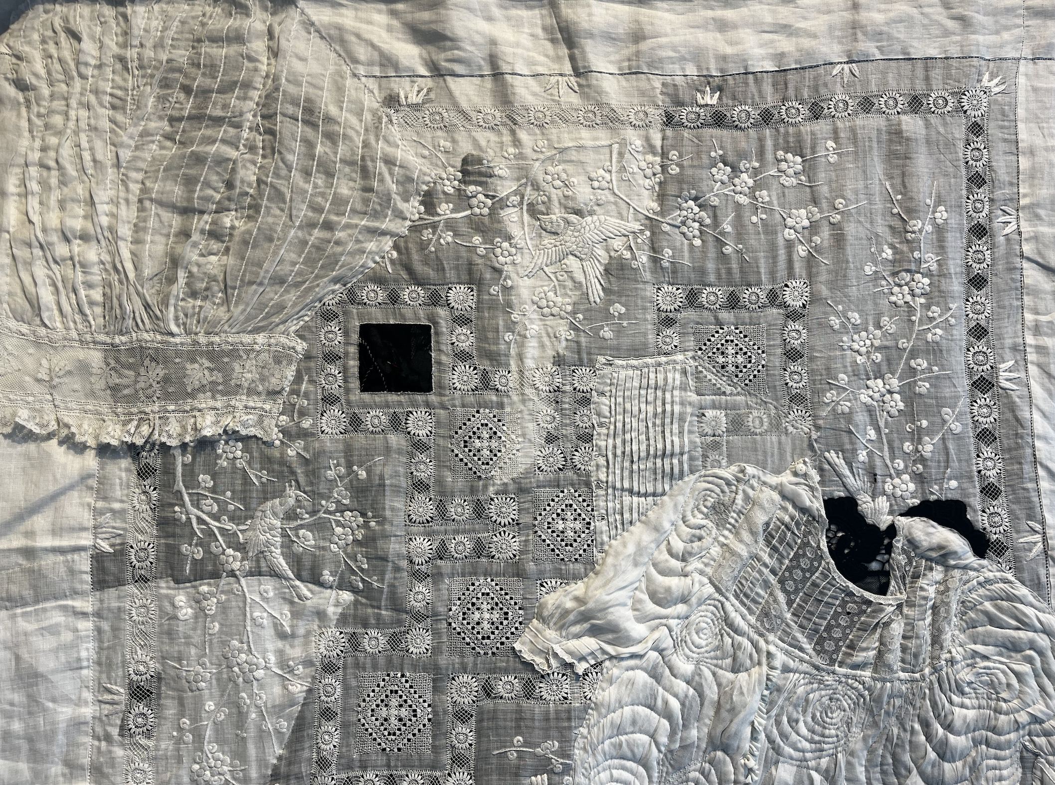Daniels’ work is the antithesis of that perspective. She gathers old fabrics whose quality speak for themselves, but that have simultaneously been wrecked by the bodies of time they’ve observed. With skill that can only develop with age, real age, she embroiders the boundaries of dark spots and tears to stitch old remnants into the eyes of a new audience with pinpointed precision. Though the fabric has been weakened with time, it’s also freshly empowered by a person knowledgeable enough to appreciate its enduring strength.