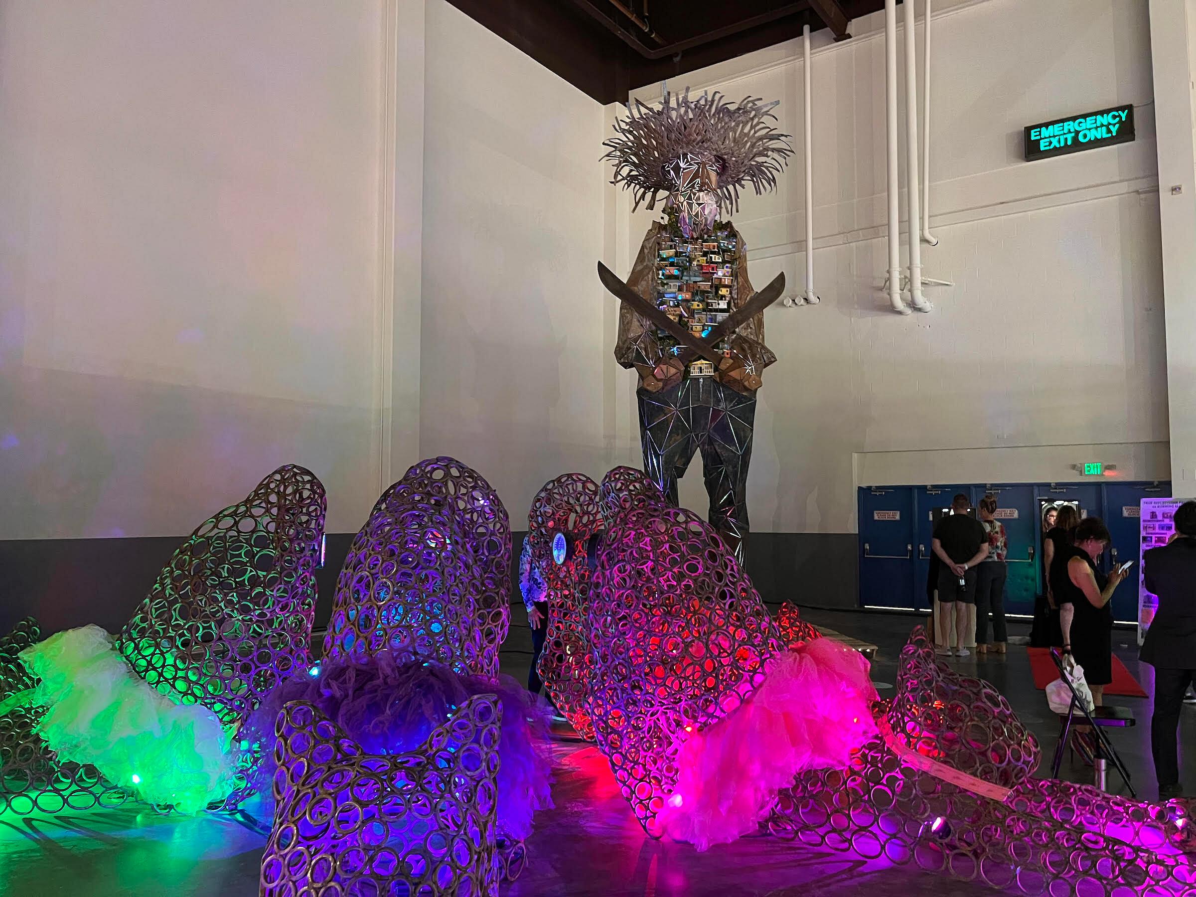 Looming large over the Reno section and dominating the outdoor entrance was post-playa art from this year’s Burning Man. The week-long desert art and music festival plays an integral role in the visual scene of this closest metropolis. Neon and weathered metal sculptures, like Mark Rivera’s Jíbaro soy…, caught my attention. Jíbaro soy… is a roughly twenty-foot-tall metal sculpture of a Puerto Rican peasant farmer wielding two machetes and neon-accented pants. But little multicolored homes and mini road signs from towns on the island fill the space where the farmer’s torso should be. It’s a beautiful representation of place and strength.