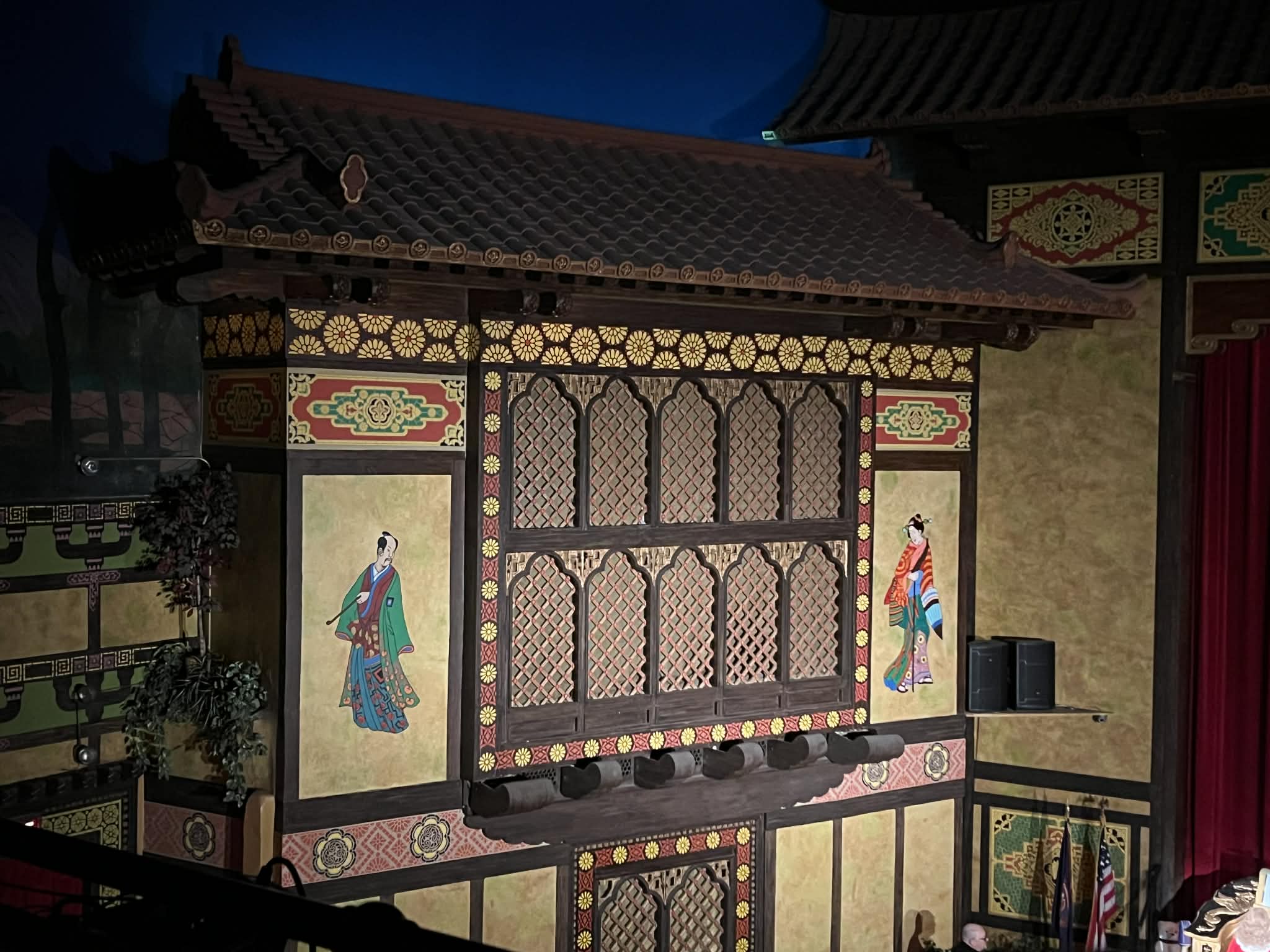 A visit to the theater itself is a treat. The 1661-seat, three-story building is built more like a traditional live-performance theater than a modern cinema with a full stage, velvet curtain and balcony seating. Its Japanese motif features traditional Japanese architecture, figures in historical kimonos and a Mount Fuji, topped by a sparkling starry night on the ceiling.