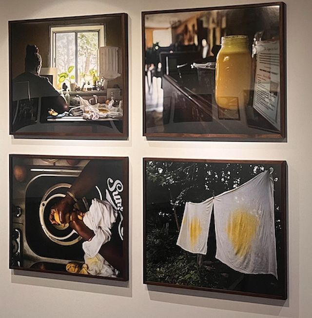Esters also shares two recipes from Awolowo in the exhibit, one for a bright yellow juice and another for the purple hull peas. Not only do photos document the process of creating those foods, but Esters also hangs Awolowo’s strain cloths and displays raw purple hull peas in a clear box. The viewer gets to admire the ingredients that make up the recipe. And by placing them next to the art she’s created, she raises Awolowo’s domestic work to the level of a piece of art. The recipes, which are printed on the wall next to their accompanying photos, bring the story of Esters’ photographs to life. We can see some steps of Awolowo’s cooking process, giving us a deeper understanding of her work.