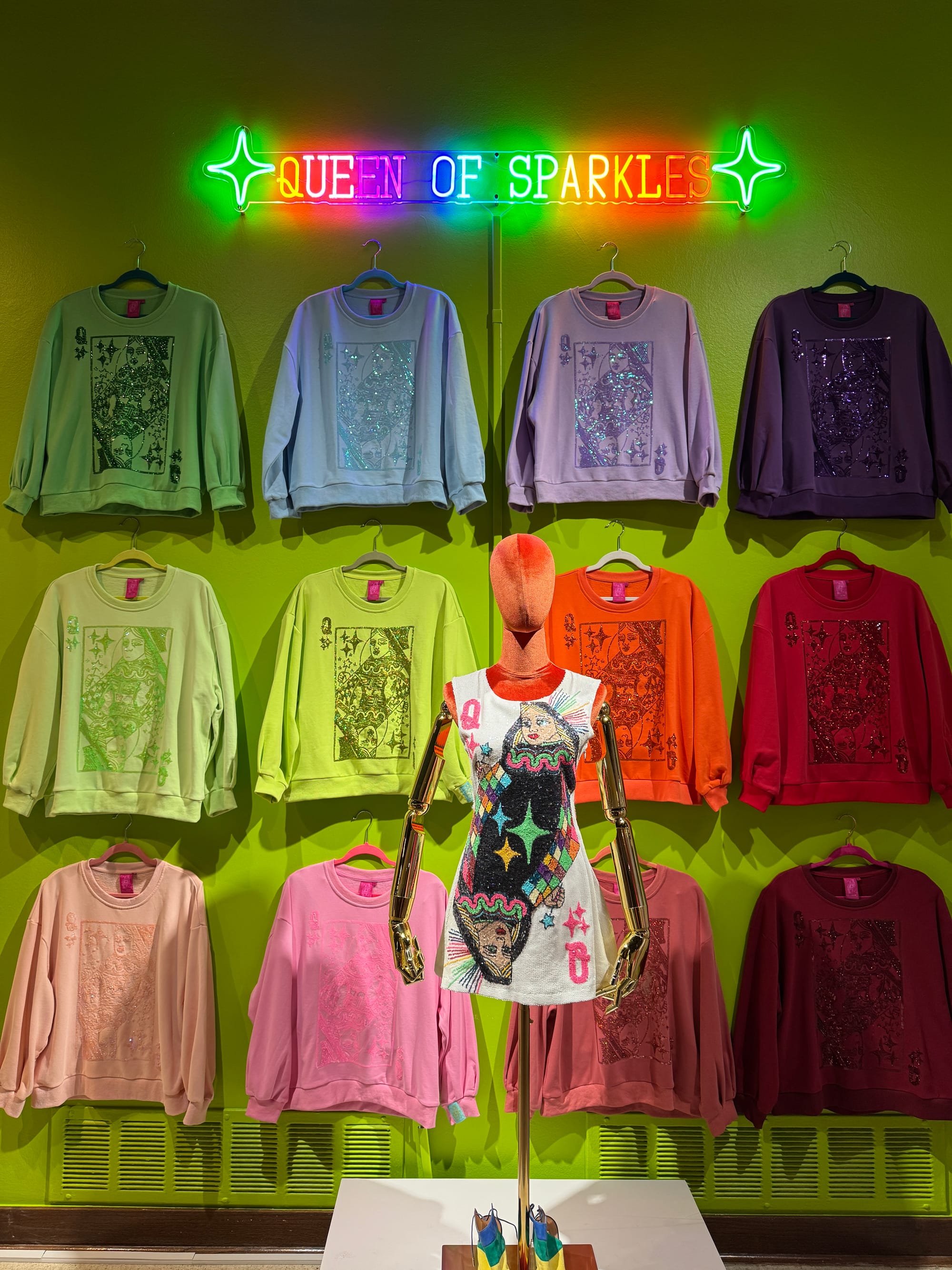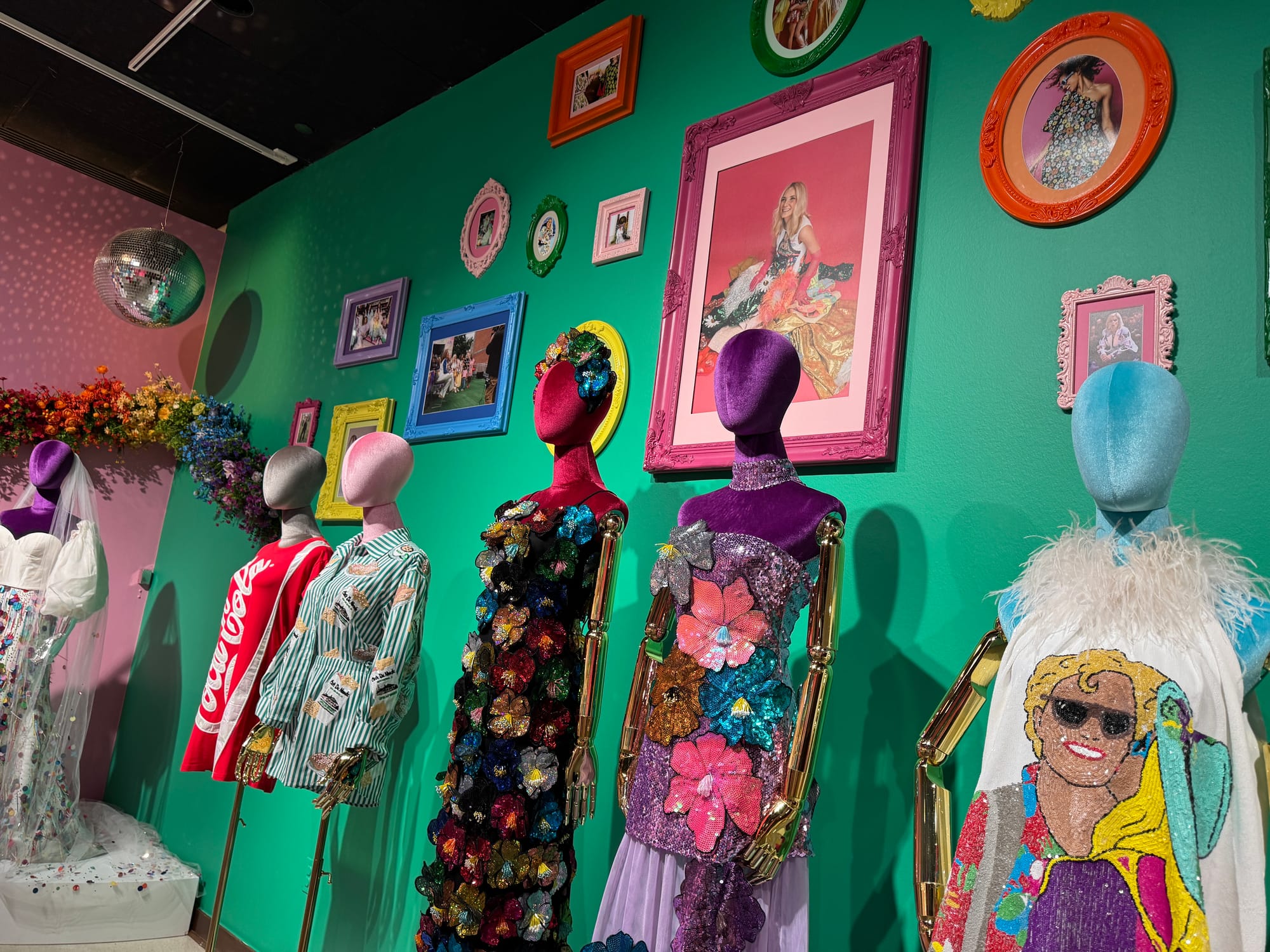The exhibit is largely focused on sparkles and less about how specifically the worlds of science and fashion are blended together. It opens with a wall of 12 sweatshirts from the Queen of Sparkles Queen Card collection ($126/each). The space prominently features outfits designed for specific events, sometimes with an additional matching outfit for Odom’s dog. Her new branded collab with Cafe Du Monde is also displayed (the shirt is not currently listed on the website, but the shorts without the shirt are $150).