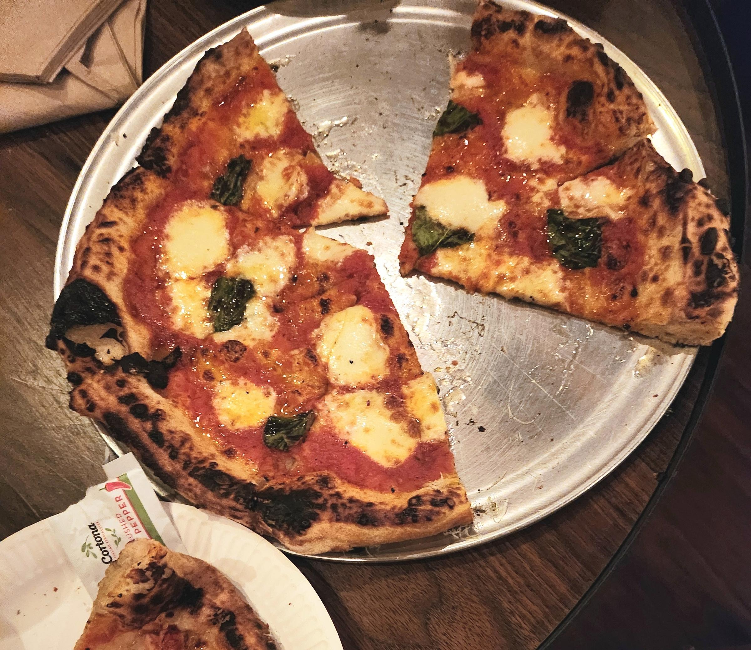 We opted for the margherita, which proved a good choice. The red sauce was sweet and tart, the cheese stretchy and creamy and smooth, and the basil an ever-perfect companion. Red pepper flakes further elevated the flavors. The crust was thin and charred, as I like, but a tad underbaked for my taste, with too much of a flop and and too doughy of an edge crust, distracting from the loveliness of the center.