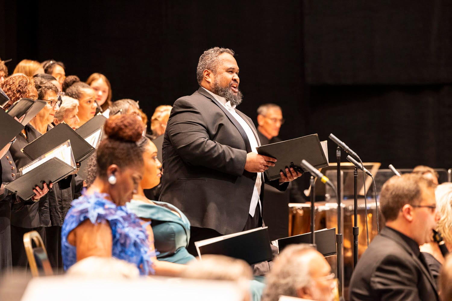 After a brief intermission, the 110-member chorus were now in their seats onstage too, along with soprano Hope Briggs, mezzo-soprano Zoie Reams, tenor Ashley Faatoalia, and bass Adam Lau. Armstrong introduced Beethoven’s 9th by saying that Beethoven was living under an authoritarian regime during its composition (1822-1824), which Armstrong compared to the United States of today. “We’re fighting oppression with joy,” he said.