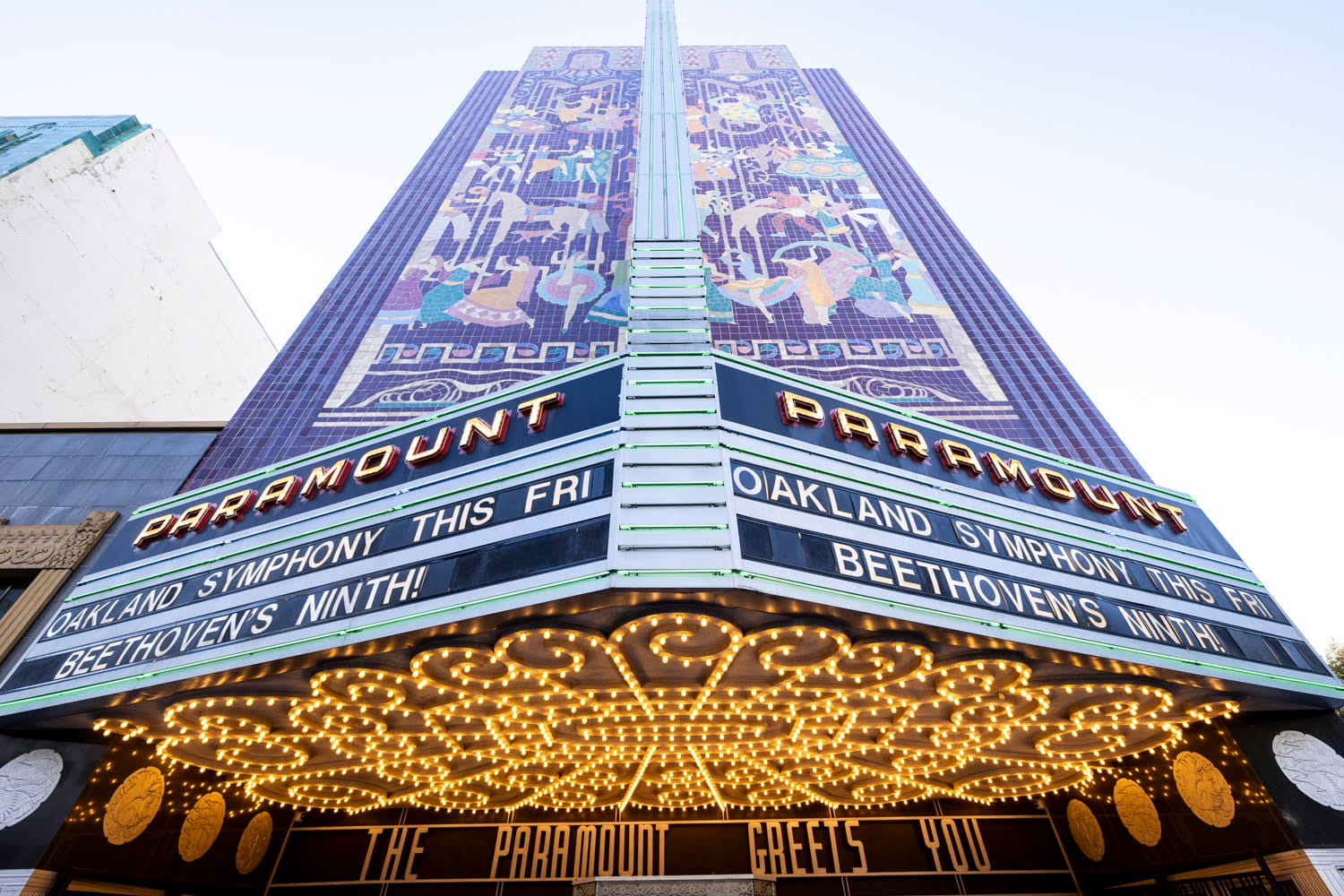 It had been a long while since we’d been inside the gorgeous 1931 movie palace and so I’d forgotten how beautiful the Paramount Theatre is. Its four-story grand lobby is breathtakingly impressive, lit in soft aquamarine and gold, and nearly every detail of the place is designed in exquisite Art Deco-style architecture, down to bas-relief wall art, carpeting, drinking fountains, and lighted aisle signage.