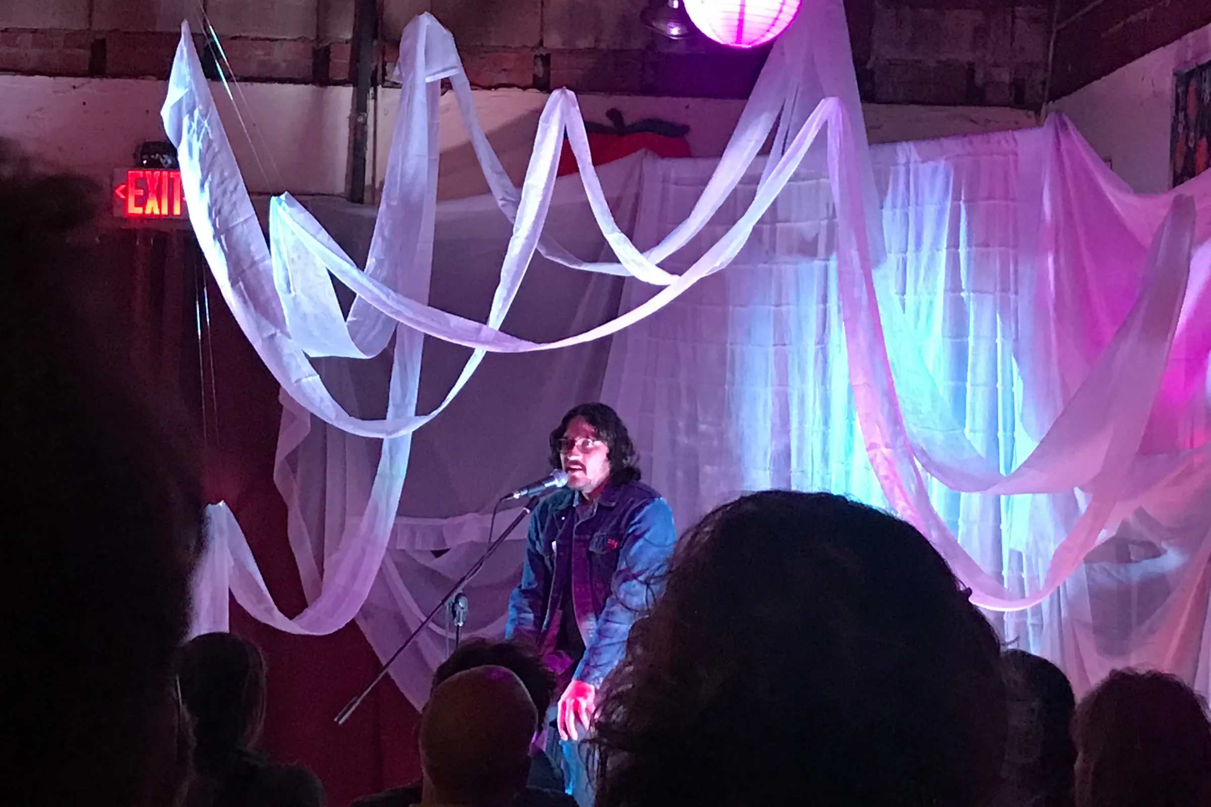Finishing out the night was Damion Shade, whose booming voice, “RAISE SOME HECK” Tyler Thrasher T‑shirt, and Greenwood Ave jacket took up the stage in his usual amiable, big-hearted way. Discoursing freely and loudly, Shade offered two versions of an old song, “Ithaca.” The first version he played on acoustic guitar, and the second on a drum machine. Between the first and second versions of the song, Shade told the crowd, his mother died. For a long time, he said, he didn’t want to make music at all. But the purchase of a drum machine and looper helped him create music that didn’t require too much effort, and with that he re-composed “Ithaca” in a different way, electronically. Throughout his discoursing, the crowd was so quiet and reverent you could hear Highway 244 outside. Impossible to come out of a show like that unmoved.
