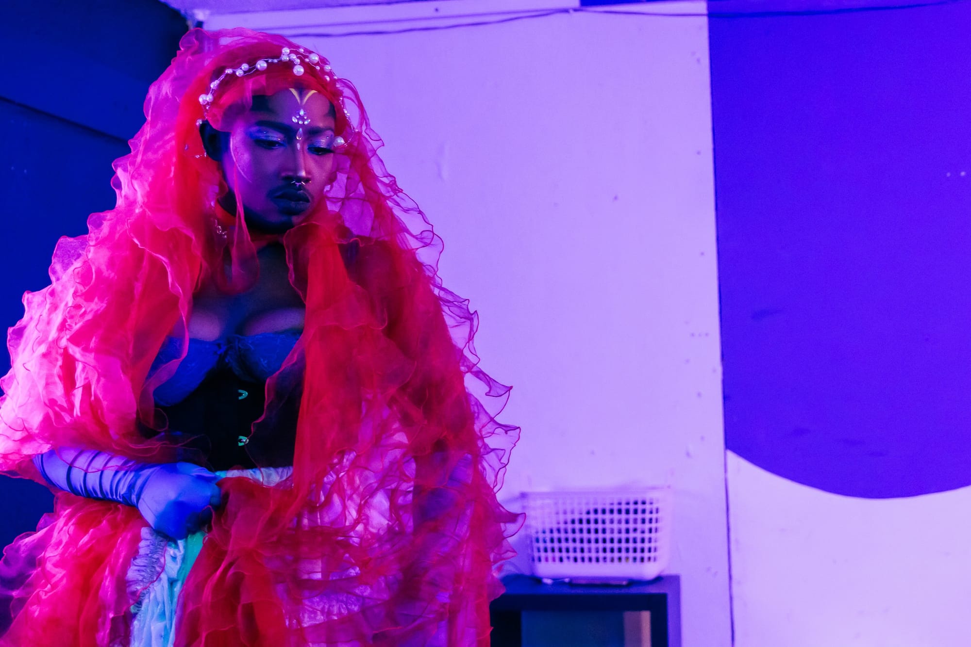 Their eyes shone bright in the dim lights of the room as they recounted a story from the 2010 earthquake in Haiti that took the lives of nearly 220,000 people. Encased in yards of red and blue fabric, they moved in and around the rhythm of the narrative. The deeply personal tale began in anger and ended in grief and wonder. Duval’s steadfast telling captivated the audience, their words serving as a light guiding us through the tempest of emotions.