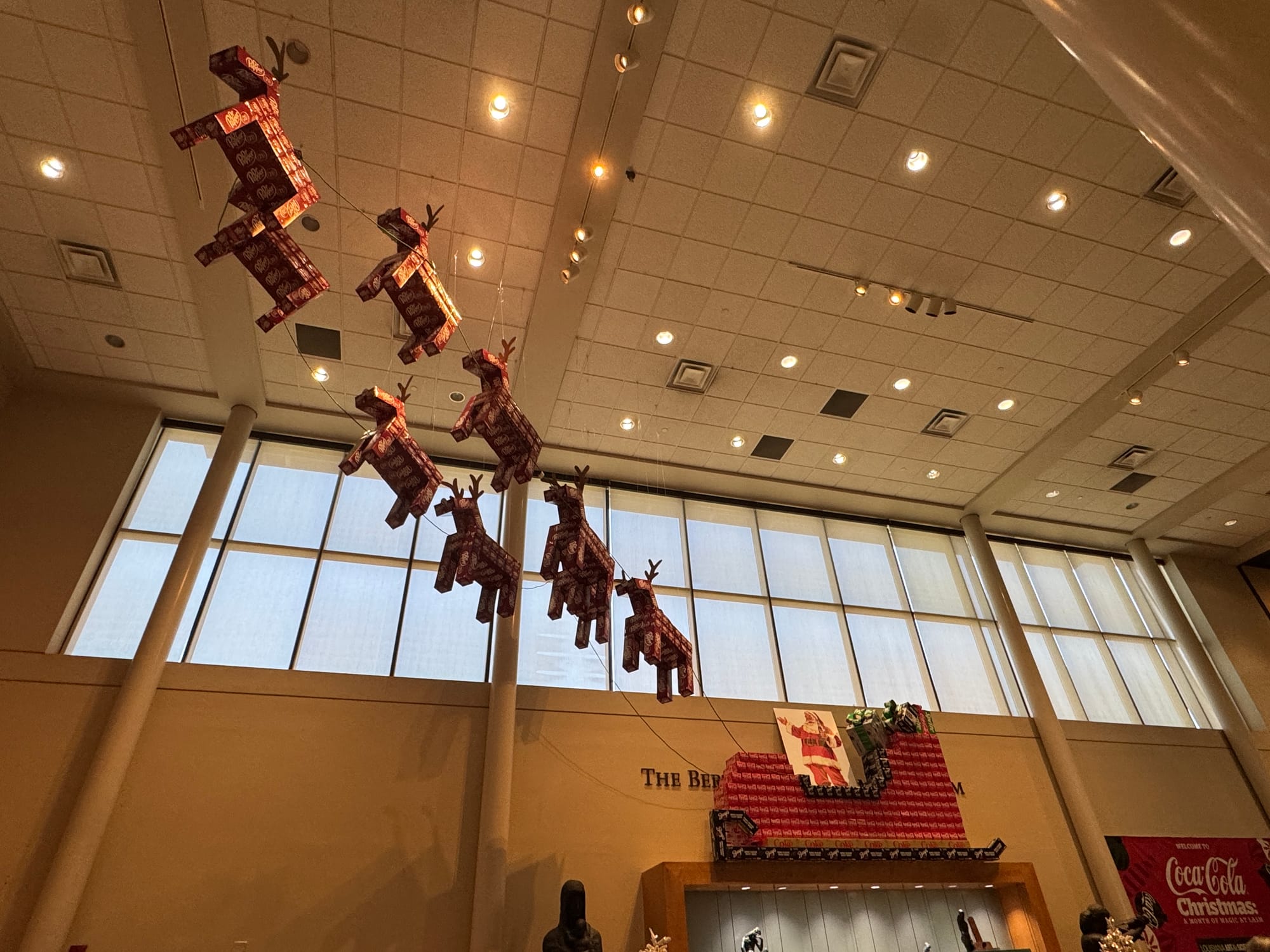 Looking at the giant train and flying reindeer made me curious about the person who made it. What is their day job? How does one become the person who organizes Coca-Cola boxes for the annual display?