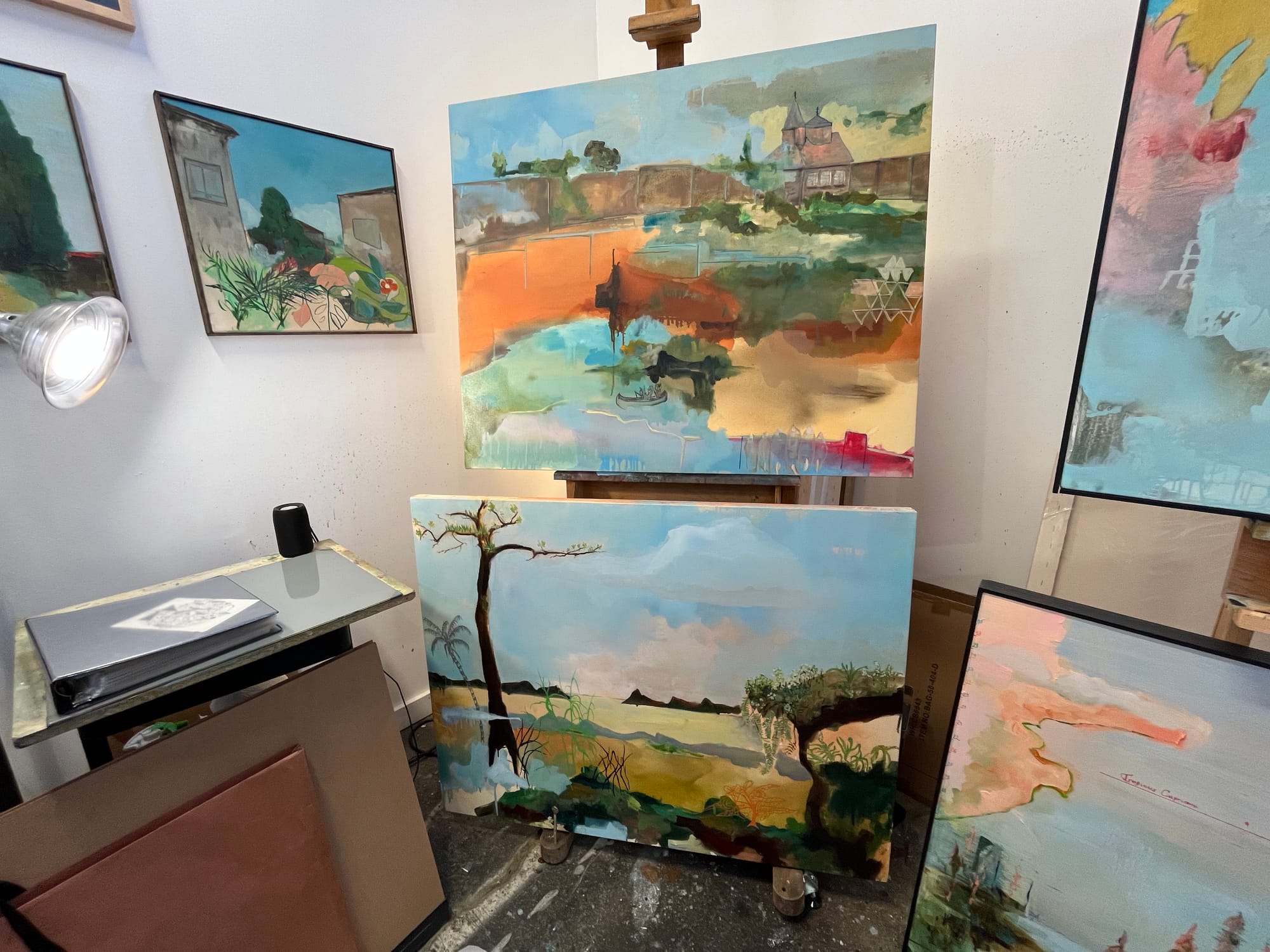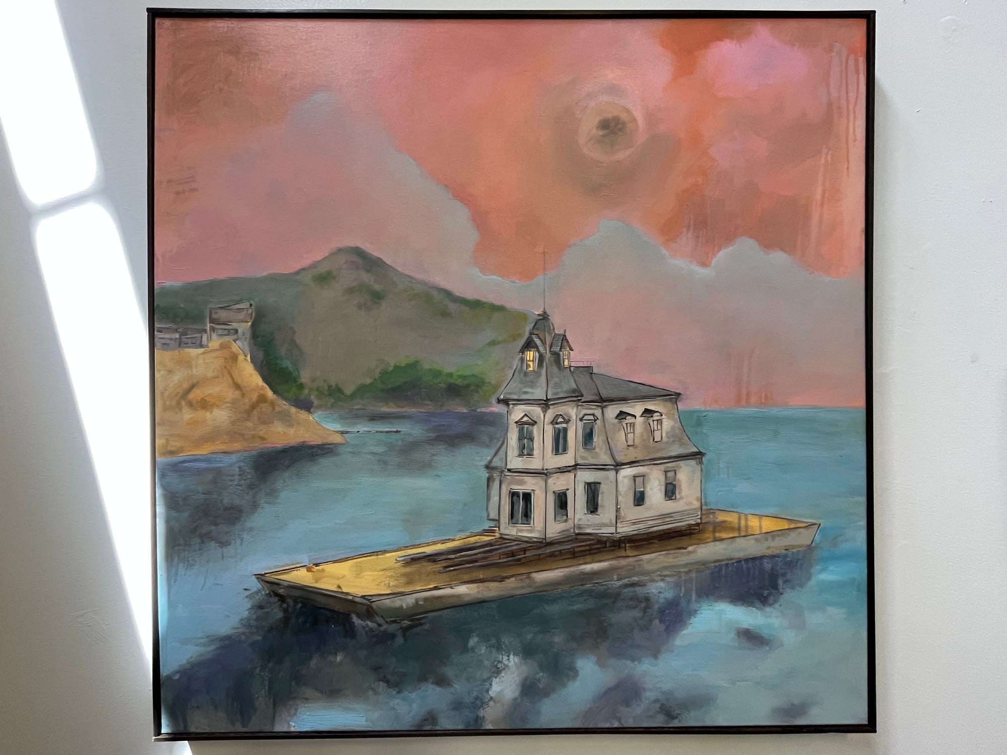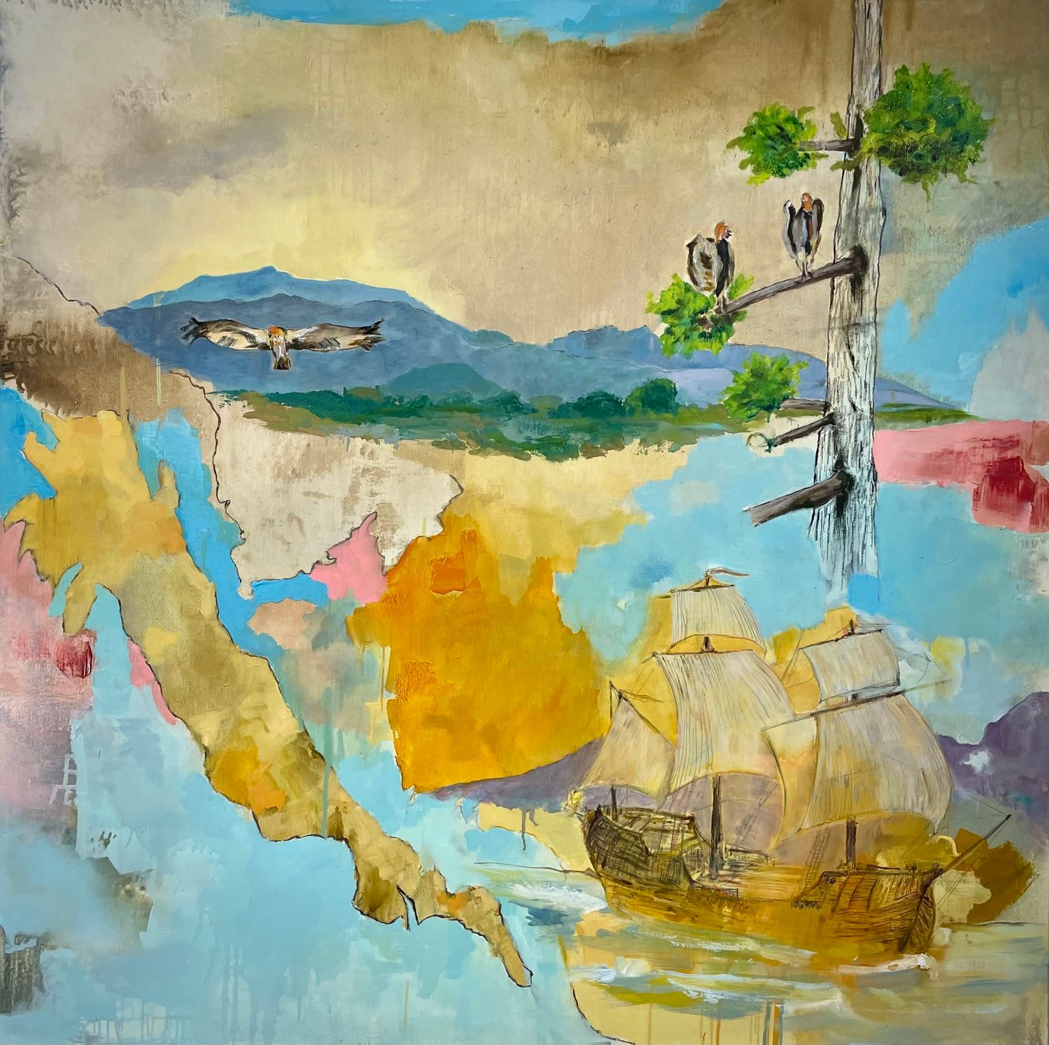 The paintings that attracted me right away in da Silva’s small, sunny studio at Norton Factory Studios were two 3 foot by 3 foot works, each of which depicts a tall ship from centuries past. They’re complimentary, featuring the same ship from two different perspectives. In “Alta California,” a large Age of Discovery-era galleon sails upon a blue-gold sea superimposed on the west coast of Mexico aside an abstracted landmass I recognized as Baja California, the Sea of Cortez rendered in gentle shades of pastel blue. A pair of birds (condors?) perch in the branches of a tree that, like the ship, is also a superimposition. It’s a complex composition full of beautiful brushwork that’s quiet yet full of motion.