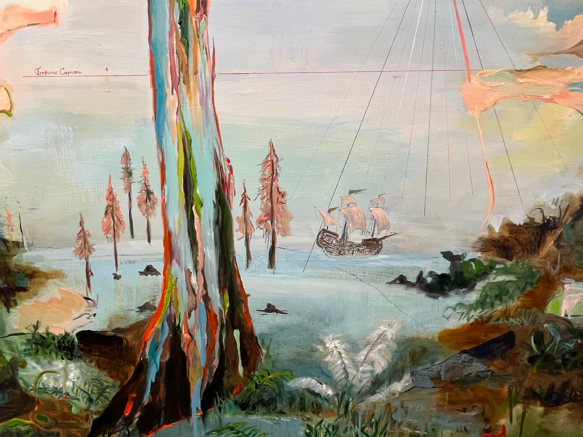 Though less bold, I found its counterpart, “The Big Sea Bird” more interesting, showing the galleon depicted from the shore, smaller, as though emerging out of the horizon. The trunk of a tree striped in browns, blues, and reds stands in the foreground. It anchors the eye, much like the tree in “Alta California.” It also features subtle lines resembling a nautical map, one of which has Tropicus Capricorni. painted in small red script just above it. A view from the shore, where the colors of the sky and flora are delicate and detailed even in their abstracted forms. This painting was my favorite, due in no small part to balanced use of negative space and perspective, the way in which it allows the viewer to be onshore, peering through the foliage.