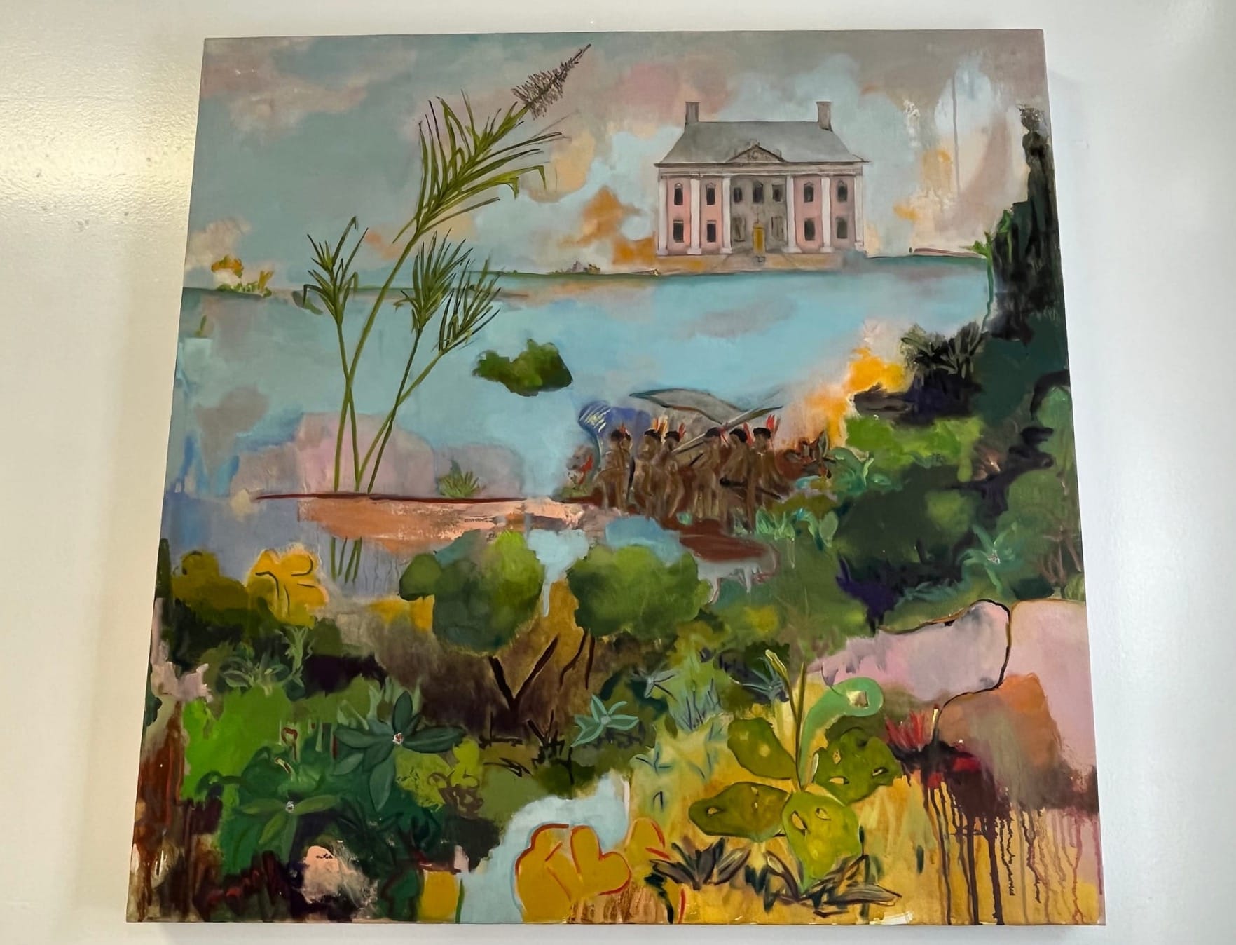 One example of this was a painting titled “Mauritshuis.” Hung a bit too high in the crowded space to view up-close, it depicts a grand mansion in shades of white and pink in the distance; in the foreground gorgeously painted tropical-looking flora. Almost lost within the plants is a group of seemingly nude people bunched together, some wearing red feathers. Johan Maurits van Nassau, a Dutch sugar baron and at one time the richest man in Europe due to the Brazil-to-Europe sugar trade, built the Mauritshuis in The Hague, da Silva explained, and sailed 11 indigenous people from the Recife area of northeastern Brazil for the opening of the mansion. da Silva said he learned about the 11 native Brazilians from W.G. Sebald’s novel Austerlitz. “They must have suffered so badly,” da Silva said. “From European diseases and the terrible weather in the Netherlands.” (The Mauritshuis is now an art museum which houses important paintings like Vermeer’s “Girl with the Pearl Earring,” Carel Fabritius’s “The Goldfinch,” and numerous works by Rembrandt.)