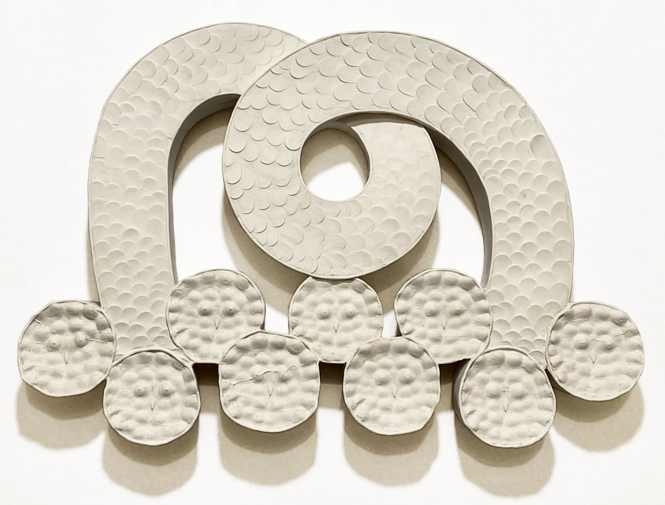 The fundamental motif in Rosenbluth’s work is repetition. This is observed in form, detail and technique: He molds hydrocal into soft loops that fold like pretzels and imprints serpentine scales into the material, playing with the innate visual power of tessellation and symmetry. That same coiled structure shows up in his sketches, boldly shaded through rhythmic marks that imbue some spirals with the lumpy realness of an umbilical cord.