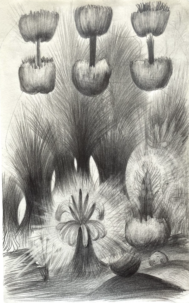 The solo show, influenced by “cosmic perspectives, Japanese dance theater, and avant-garde theatrical concepts,” features a series of surrealist sculptures and pencil sketches that animate and articulate the shapes of our existence without imposing any overt meaning.