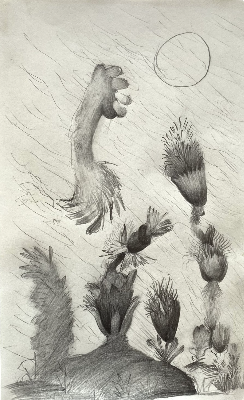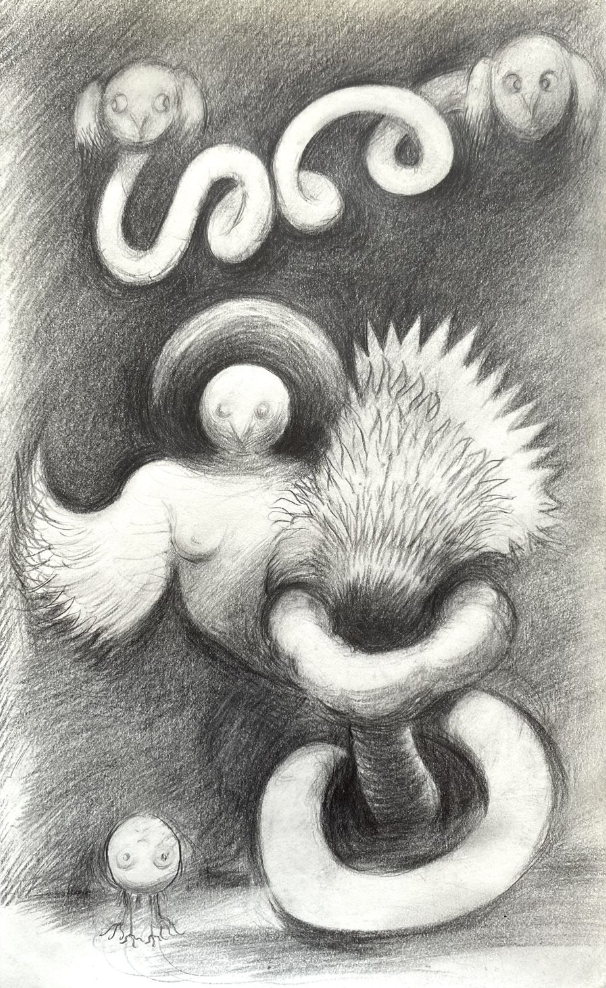 At the ends of these life lines are ornithological faces, most of them owl-esque. Scattered throughout several of the sketches are eggs, sometimes enlivened by eerie eyeballs. The pieces illustrate the rules of regeneration and yet are always punctuated with the wisdom an apparent end point. There’s no argument about which came first, as in the chicken or the egg. Instead, all these animalistic elements, whether predator or prey, neatly coexist.