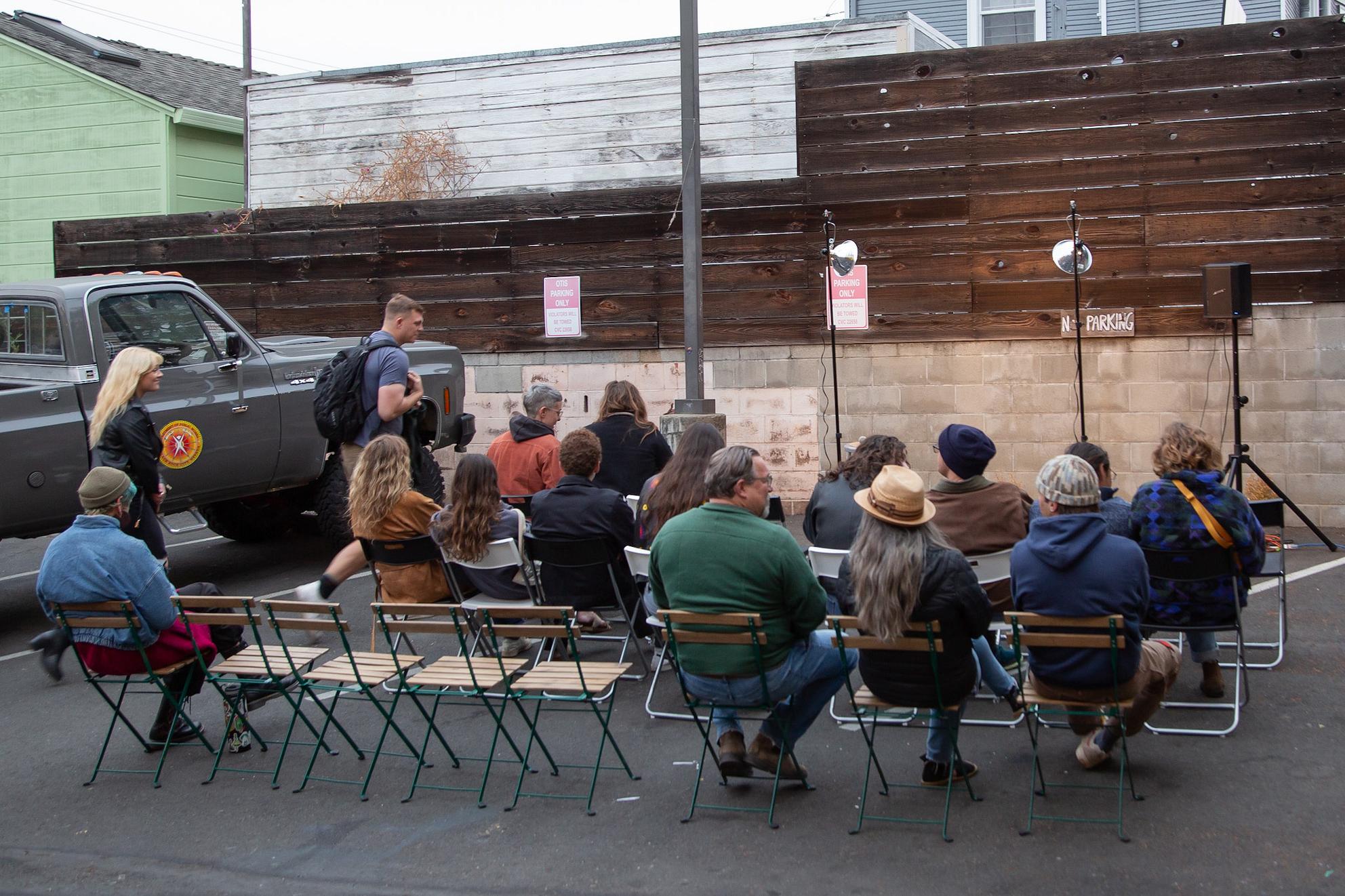 At 8:15 Thewlis walked onstage, snagged the microphone, began to speak, only then turning off the music playing from the phone in his pants pocket. “We started out about three years ago inside the restaurant, then got too big for it, and now ….” Thewlis began. He trailed off, glanced at the small crowd, and smiled. He introduced himself and the show, and after a few minutes on the mic handed it off to Pete Ballmer.
