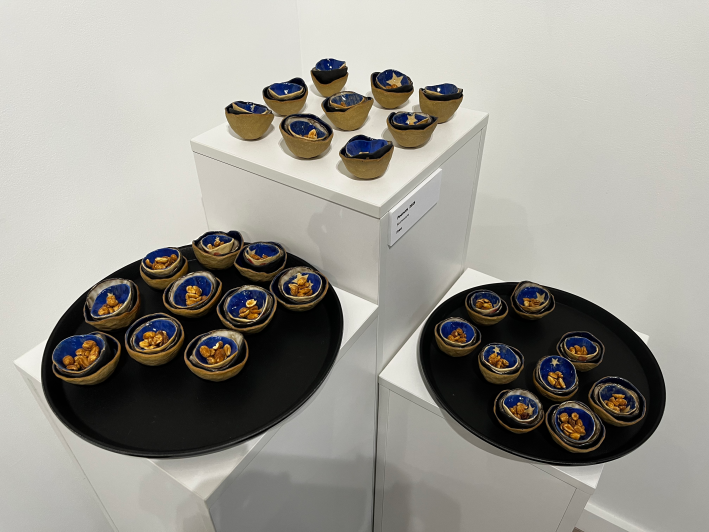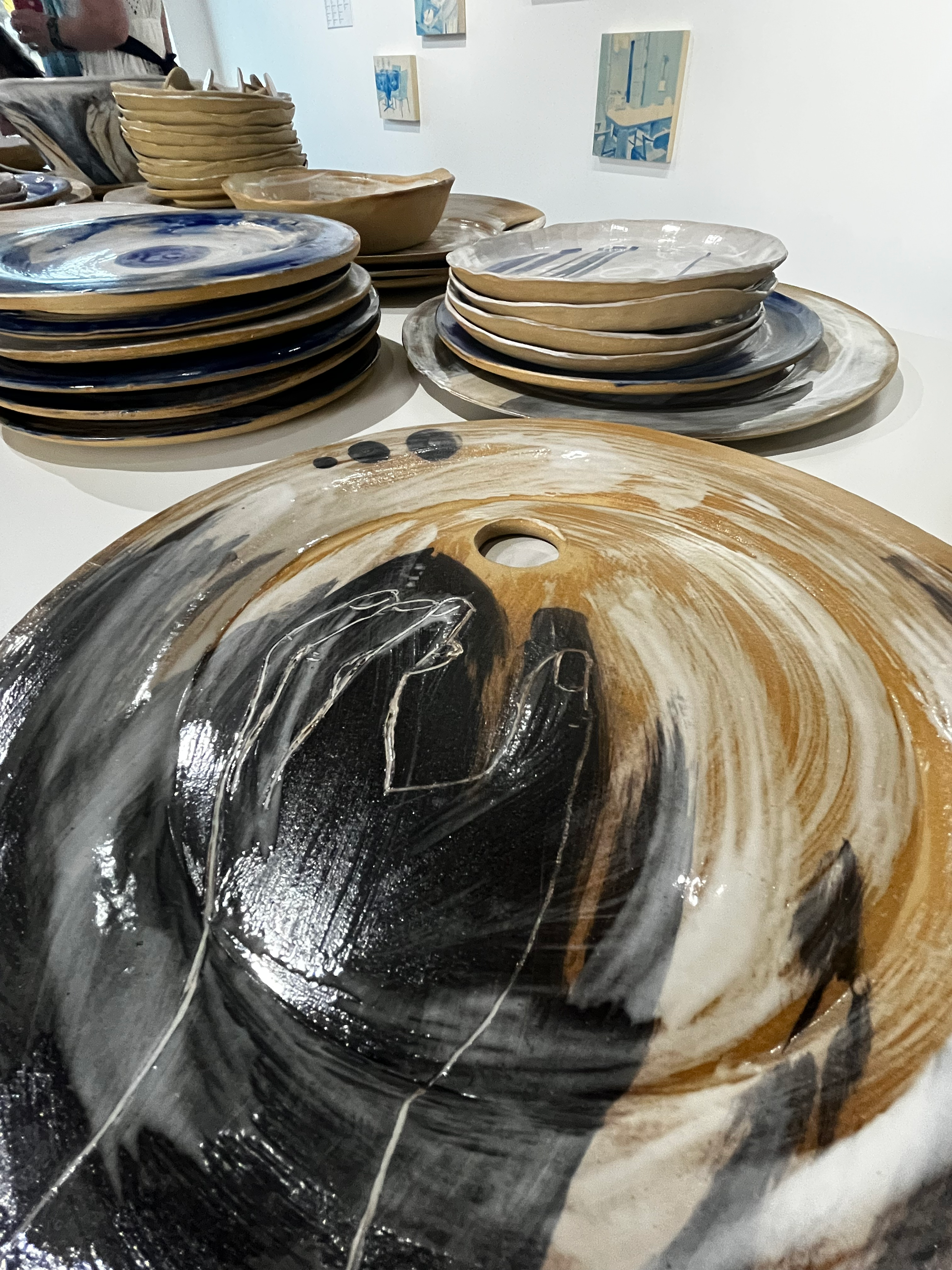 Del Rio was eventually able to leave the industry and return to more stable work, but what she saw and heard stayed with her. “It didn’t feel right to just walk away,” she said, so she and a chef friend decided to organize a dinner where restaurant workers could safely gather—to be served themselves, for a change, and to have a conversation about wages and labor rights, out from under the prying and abusive eyes of their employers. Del Rio made custom ceramic plates for that dinner, each painted with a hand reaching toward a hole that represents the “coin,” the “tip,” the missing value. Those plates form the centerpiece of “Mise en Place,” stacked on a huge table in the middle of the gallery.