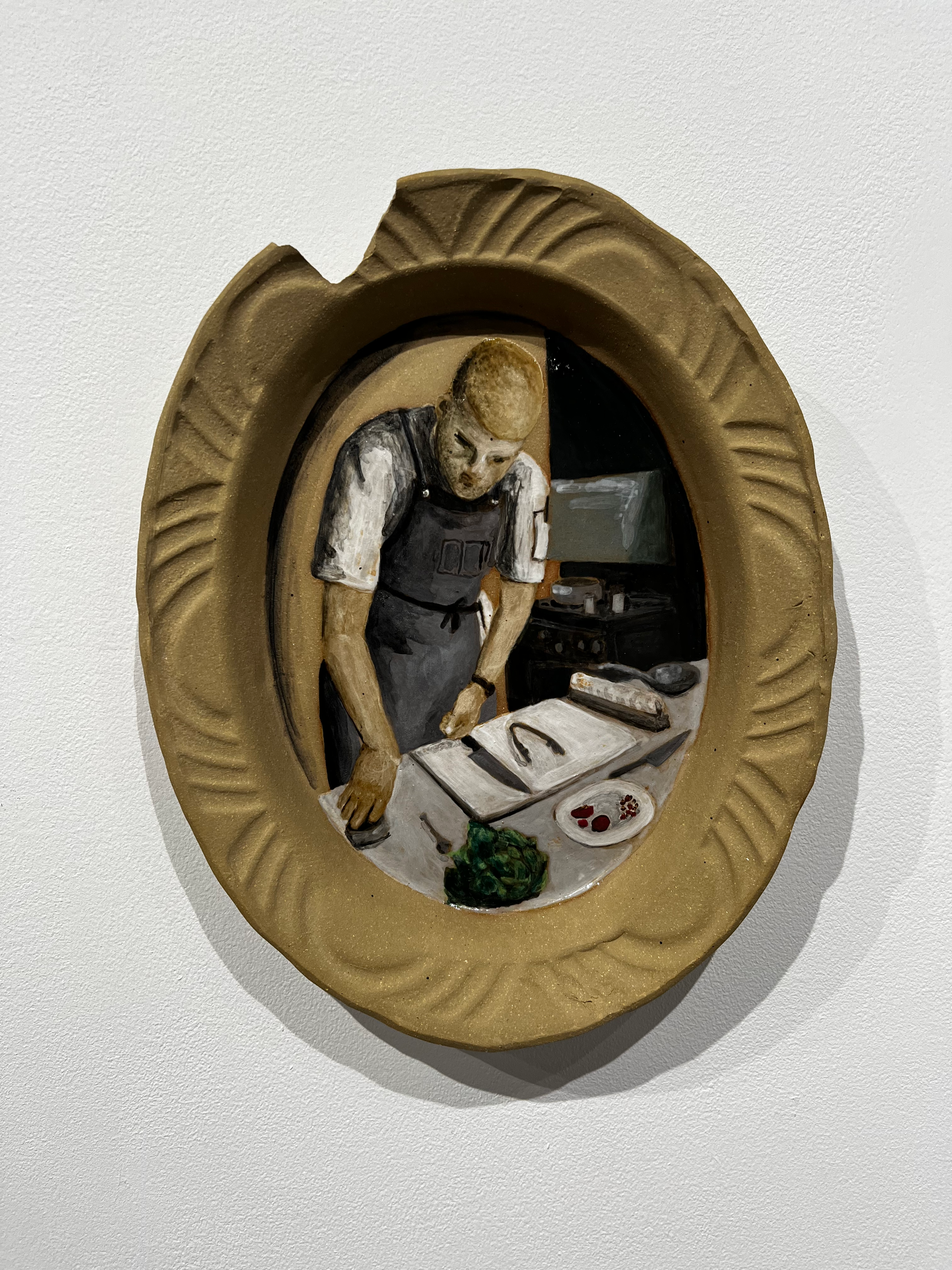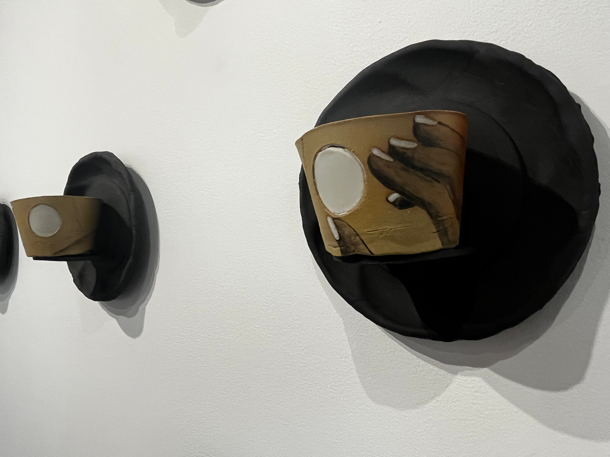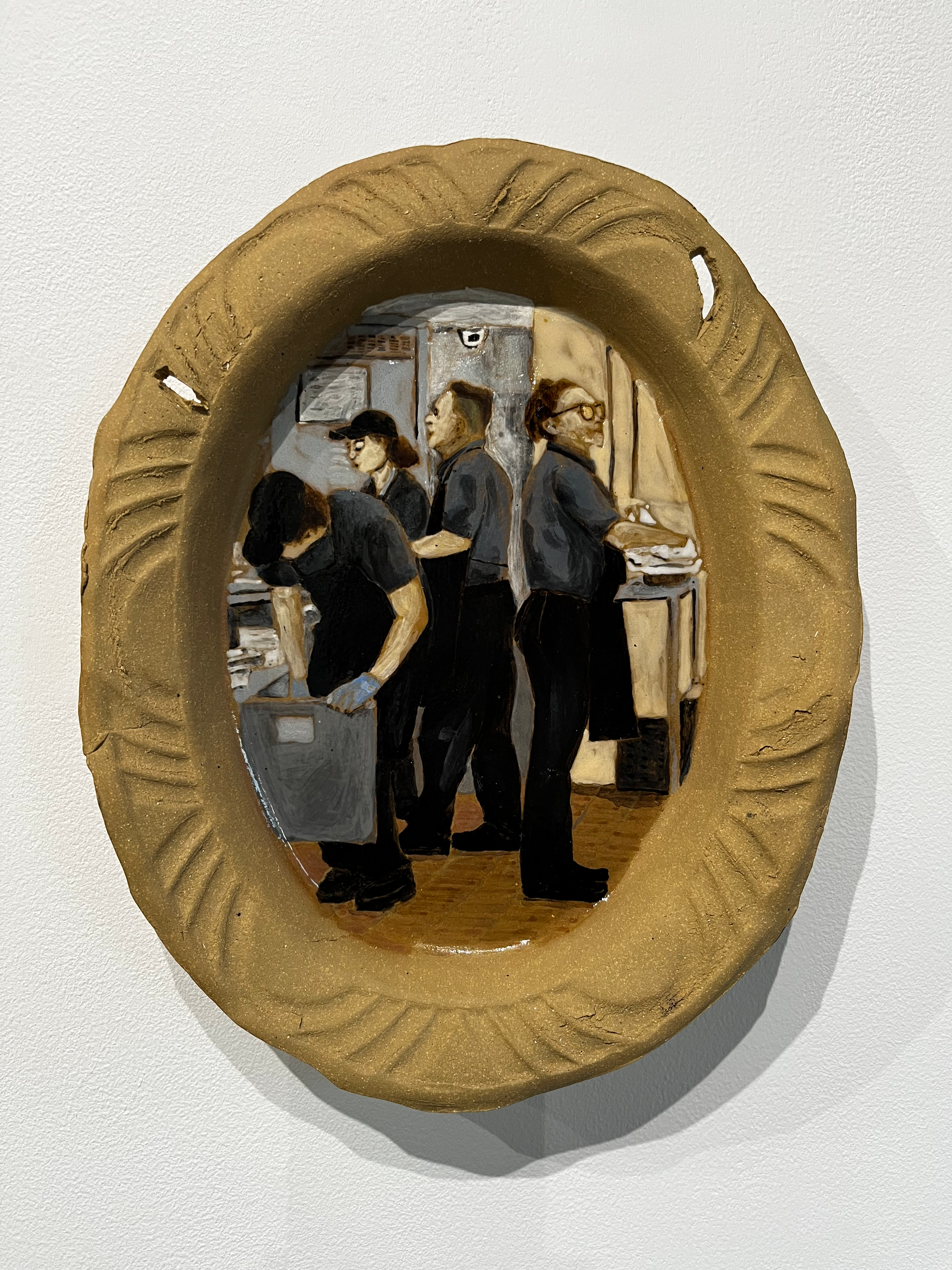 On the opposite wall, a series of “commemorative plates” render the restaurant workers del Rio worked with in loving detail. The plates themselves remind me of a pie crust, with a gritty texture whose pale brown tone makes the hyper-detailed, almost glossy back-of-house scenes pop. A similar mix of roughness and refinement marks a series of stoneware and porcelain cups called “Origin of the American Precariat,” which pick up the imagery from the original plates—the coin here as round and white as a eucharistic wafer—and add a round black backdrop onto which the cups are precariously attached.