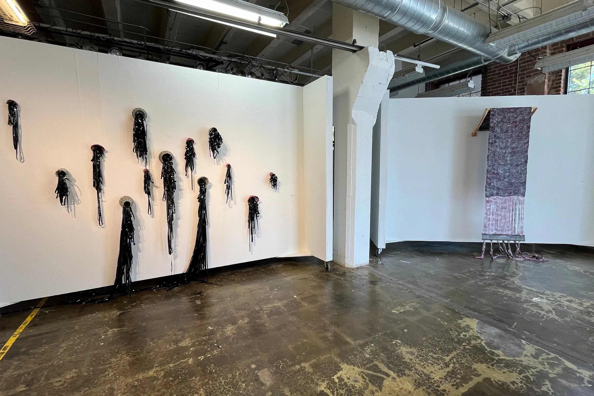 And the three large pieces by Garner provide a way to think conceptually about what this place does, with their VHS tape spilling out of handwoven baskets, hanging in a tight weave on a loom, or webbing across the ceiling in the west corner window. How does an ephemeral experience — a performance, a cultural phenomenon, a phase in a city’s creative life — get “captured” and “shared” and “preserved”? How does memory shape the environment we’re standing in now? What’s still undiscovered, ripe for further experimentation, in the creative history that’s brought us here?