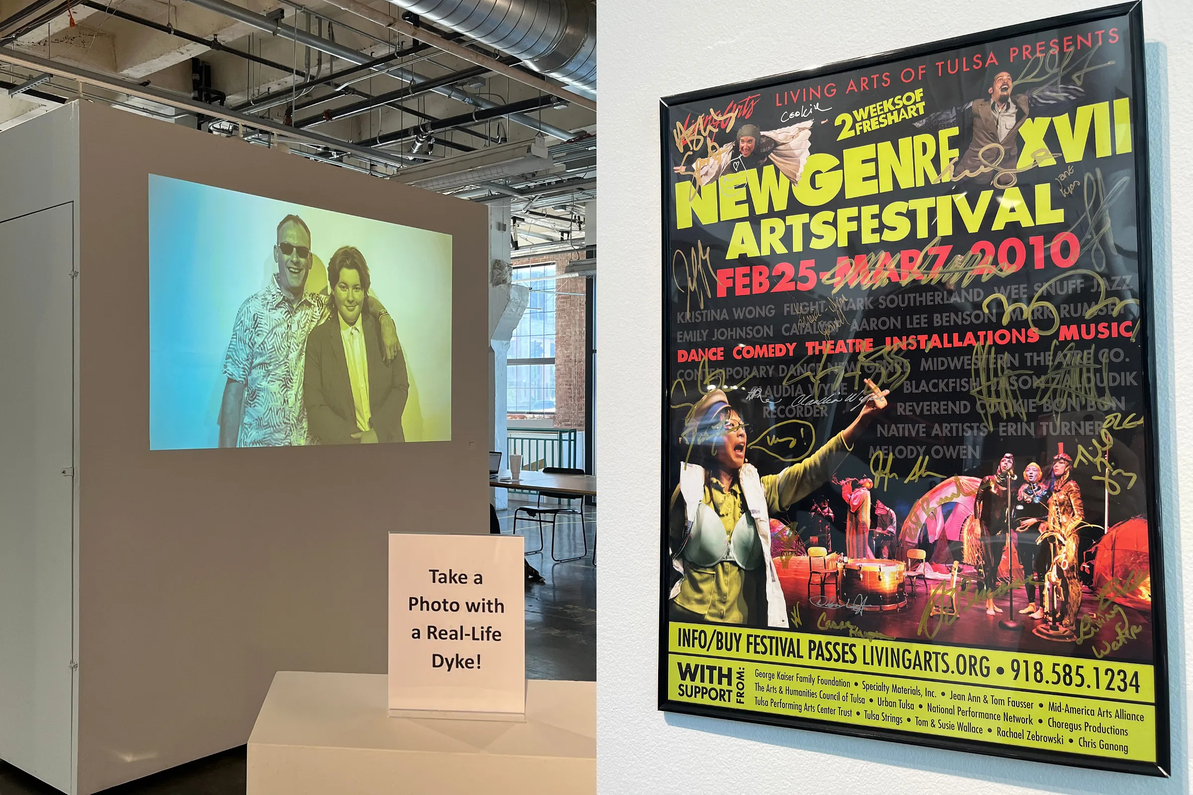 That said, I enjoyed looking at the framed posters from New Genre Festivals past, which tell their own story about the dynamism that’s lived in Tulsa through Living Arts and the insane hard work it took to pull it all off. Past performers include Marina Abramovic, Meredith Monk, Kristina Wong and Emily Johnson, as well as local artists; festivals would take place at venues all over the city, with people running from one to the next to catch as many events as possible. (New Genre, which started in 1993, has been dormant since the pandemic.)