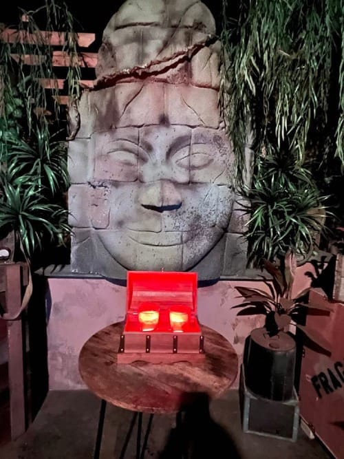 A visit to The Lost Outpost begins with a backstory: “Many moons ago” the Legendary Expedition Co. mysteriously vanished in the South Pacific after establishing a basecamp in pursuit of a cursed volcanic temple rumored to hold unspeakable power. Now that “lost outpost” has been found, ready for visitors to explore while enjoying tropical spirits and tiki-themed food.