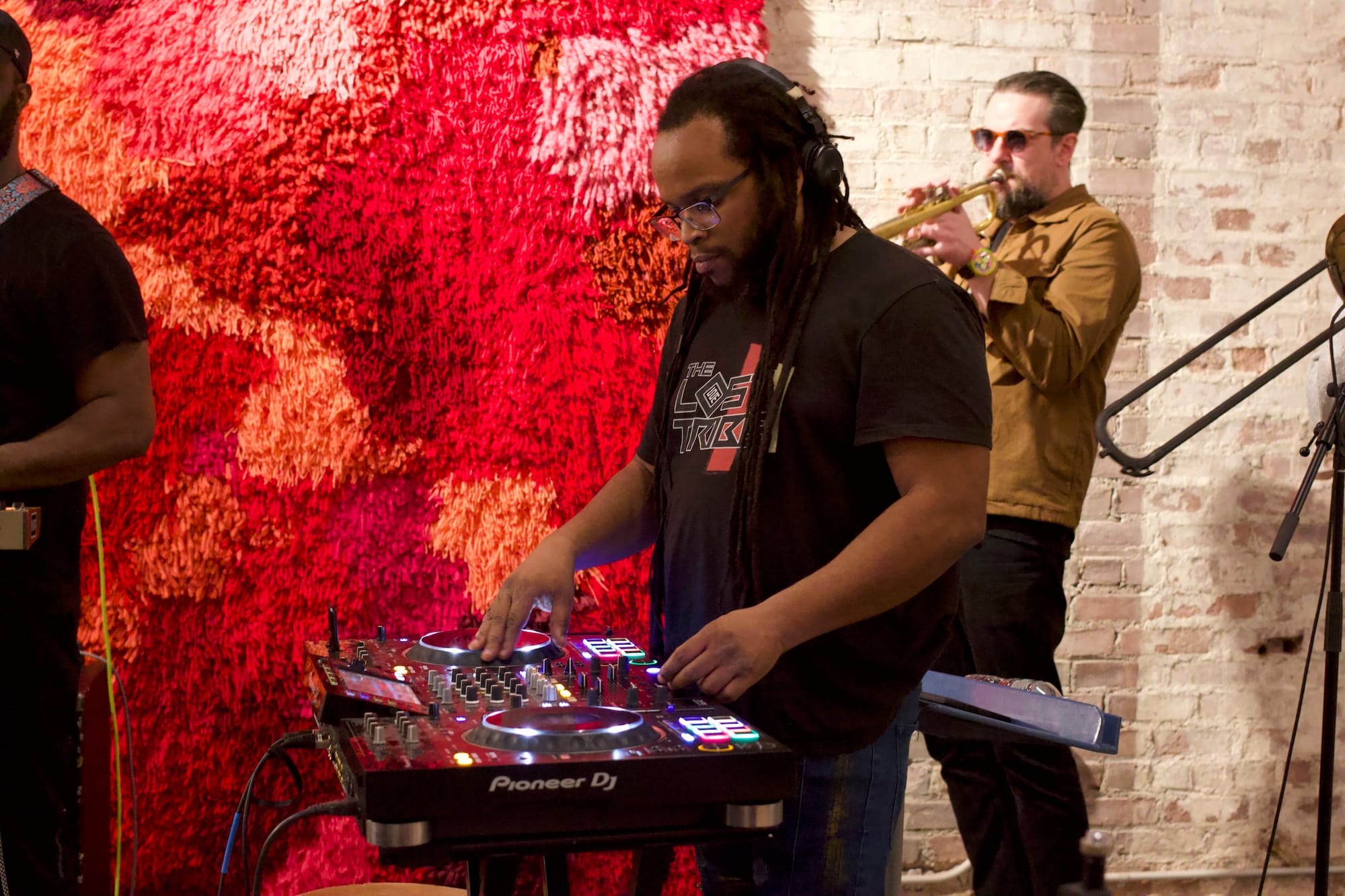 The band’s two sets were filled with repetitions of motifs from West African, Latin American, and Black American cultures. Instruments followed each other’s lead, recreating and transforming every offering. As the record breaks of a turntable echoed rhythms from the drums, DJ Stealth adjusted his headphones so his left ear was sometimes exposed to the sounds of the room, sometimes locked into the beats he was making.