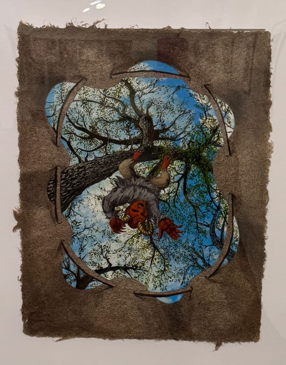 The artists interpreted the folktales in their own styles mostly on bagasse and banana leaf paper made specially for the exhibit. There’s a lot to see and a lot to read, but the most striking piece was Jonathan “radbwa faroush” Mayers’ “Djab gardé enba” (The Devil Looked Down), which was painted in acrylic and accompanies “Catafo.” In the story, the siblings find a small house in the woods to take refuge. That’s where similarities to Hansel and Gretel end. They’re in the devil’s house. While the devil’s wife is nice and feeds them, the devil is blood hungry and ready to eat them. The painting makes it look like readers are in a scene from the end of the story, looking up from inside a bag up at the devil falling from a tree. It’s perspective work that enriches the story rather than simply illustrating it.