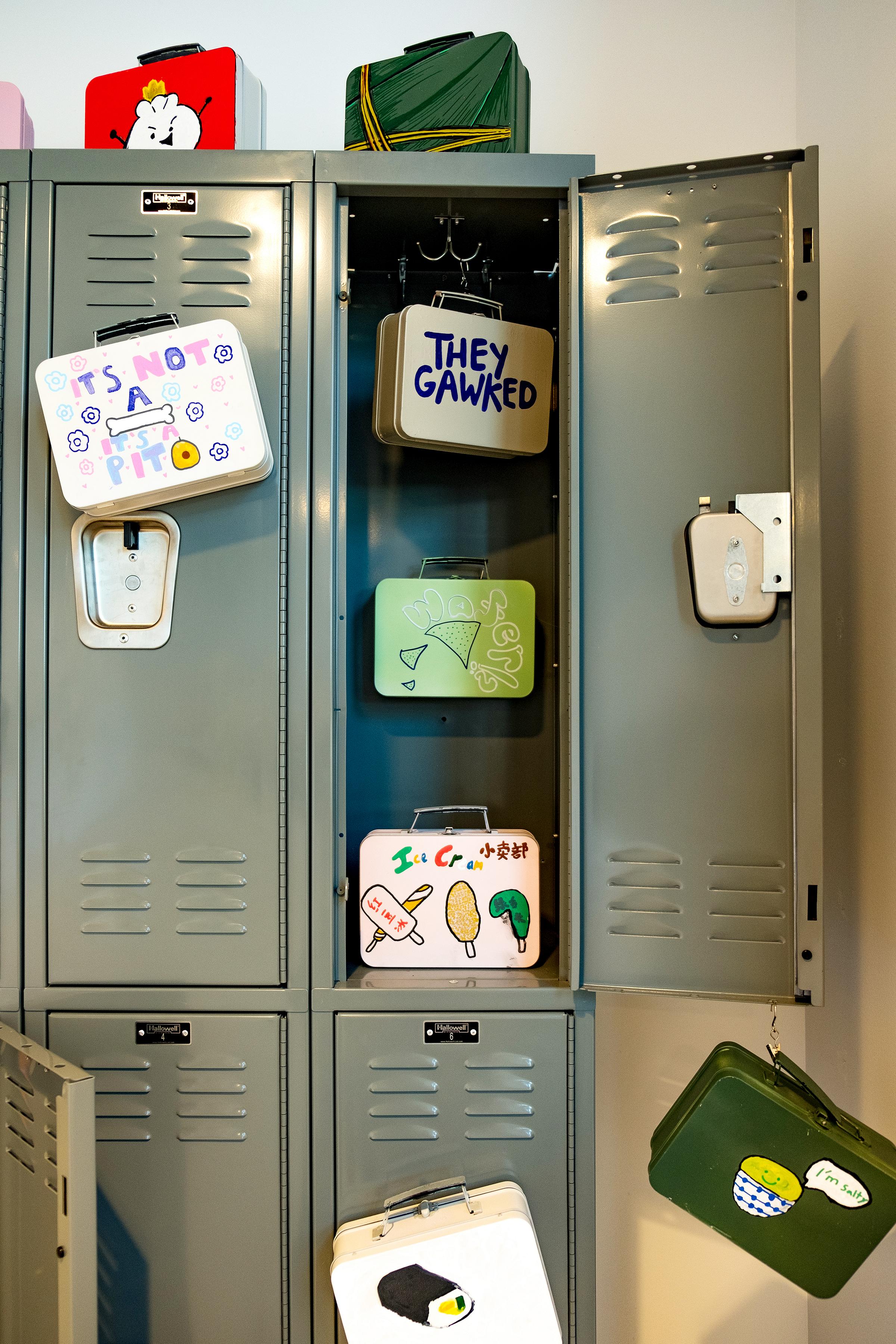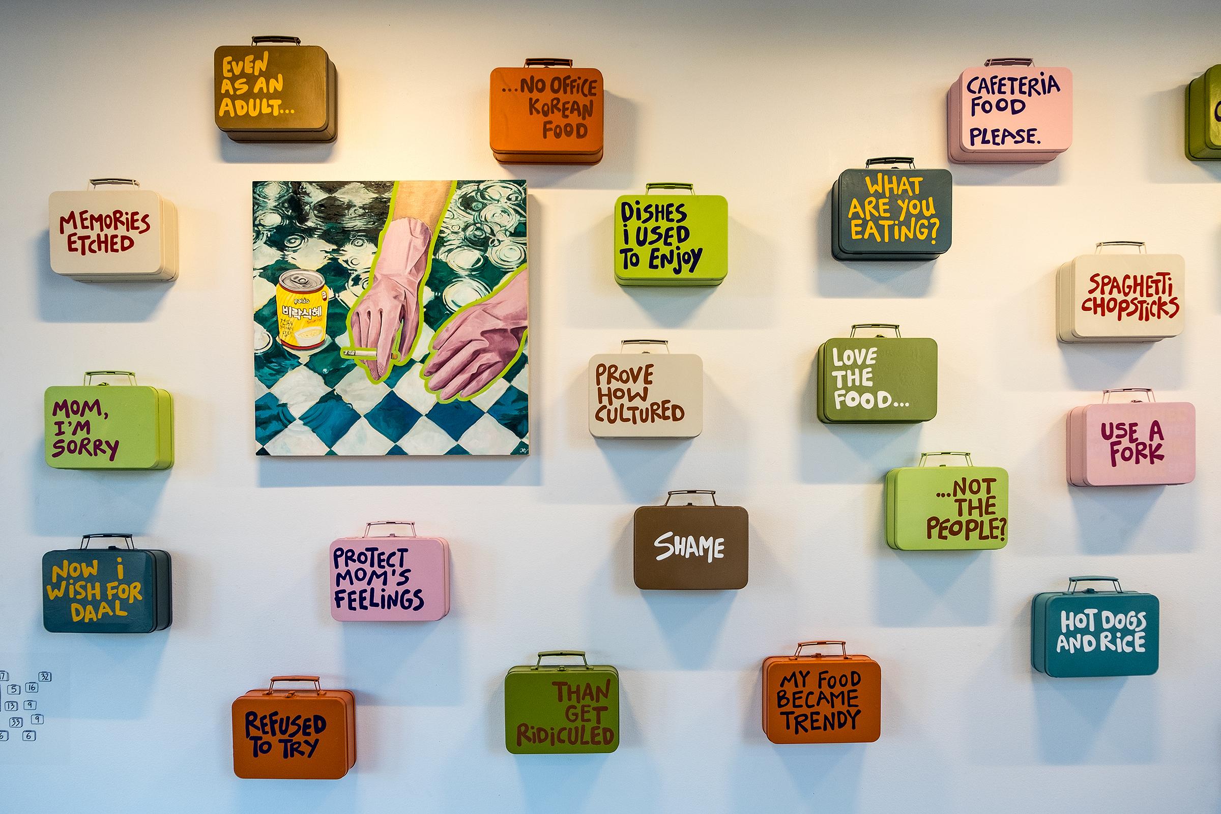 Instead of seeking to hide these moments of complexity or shame or humor or difference, the lunchboxes on the wall celebrate them as art. A locker at the back of the gallery adorned with lunchboxes created at Boston workshops produce the hint of a school environment; brown bags hanging along the back wall invite visitors to write their own lunchbox moments — and here, too, there are broad reflections, connections, and personal explorations. The result is a colorful, collective community of shared experiences, allowing visitors to feel like they are truly taking a seat at a collective table.