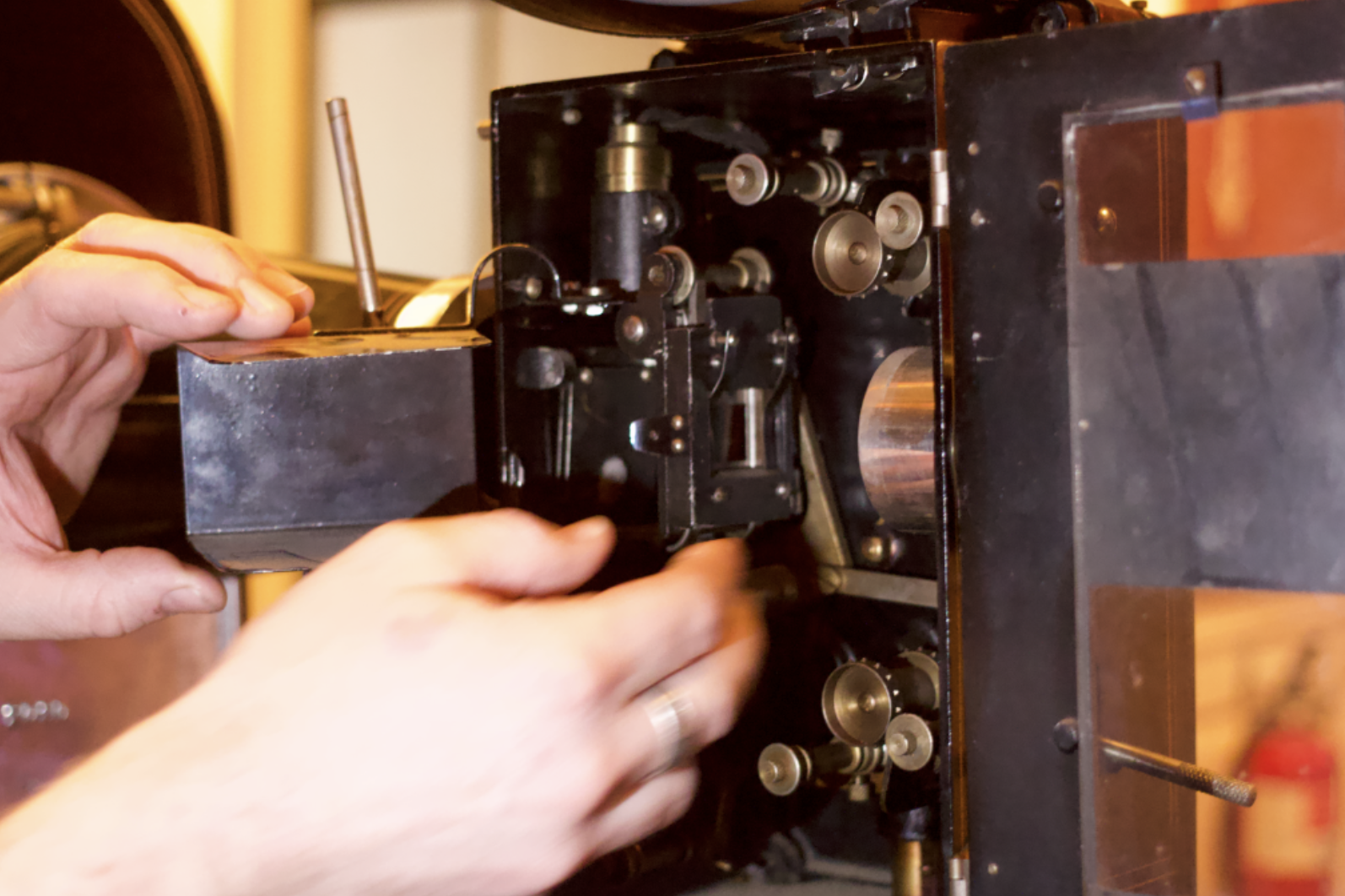 I watched in real time as the small team gained confidence in their ability to get the vintage machine in working order. I learned that it was great news the projector did not use a “carbon arc,” a process that Burgess said was “super hot, super flammable, dangerous, and dirty.” The friends discussed whether an audio component existed, concluding that the projector most likely pre-dated the talkies.