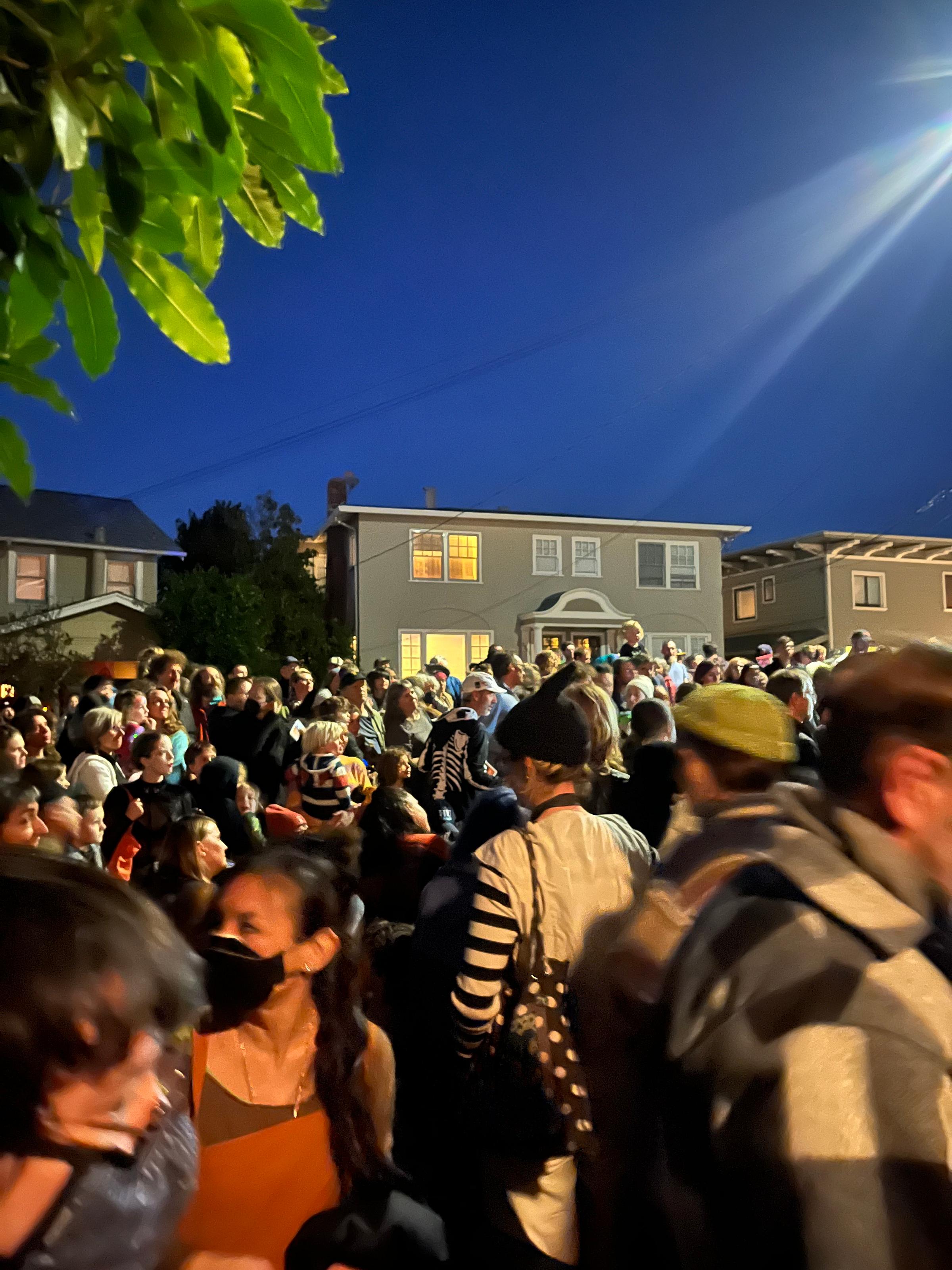 Even if my mini-hike hadn’t paid off (it did), the visual delights of Driveway Follies were abundant beyond the stage. Black-and-white projections of spookiness were lit upon the house on Greenwood, constantly changing frames. At the top of a brick staircase lined with jack-o-lanterns was a deck filled with more scary lighted projections; a tree with a face where a skeleton clung to a branch; and a cauldron stirred by an ancient hag whose boiling concoction one little girl wasn’t very sanguine about standing next to, posing for her parents but obviously glad to be away from the frightening witch once their photo was snapped.