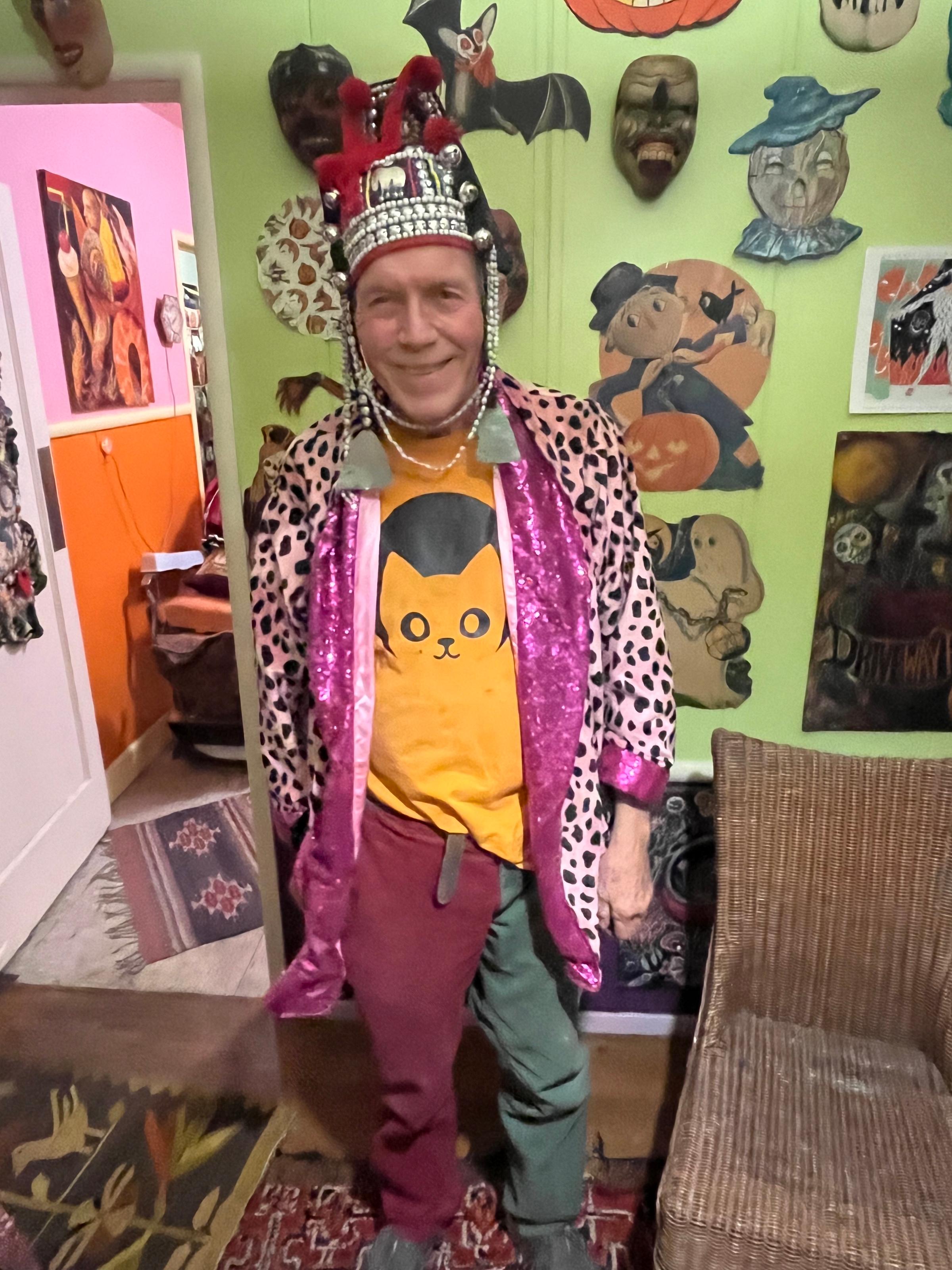 Founder Larry Schmidt’s life partner, Carl Linkhart, whom I spoke with briefly inside his delightfully decorated home, now sustains the production. A soft-spoken man dressed in perfect Halloween attire, Linkhart voiced the part of Jitters, a cute little marionette bat whowas the familiar to our marionette introductress, a witch on a broomstick named “Aunt Grandma” (voiced by Opie Bellas).