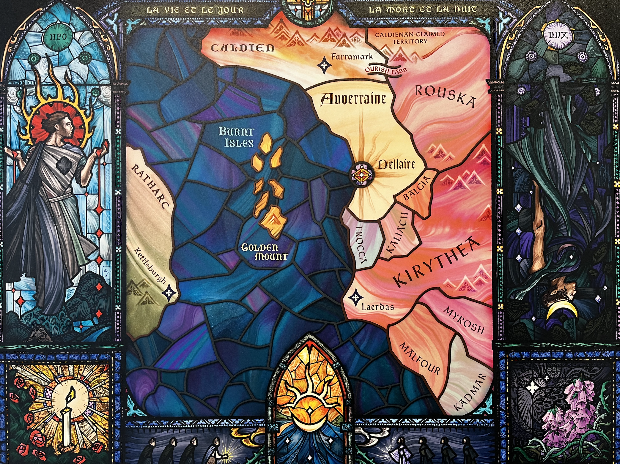 Her map of a citadel from The Nightshade Crown Trilogy burns geography into the fragile stained glass of a church window, integrating panels of traveling muses as borders and 15th century gothic typeface as an homage to the time period of the book.
