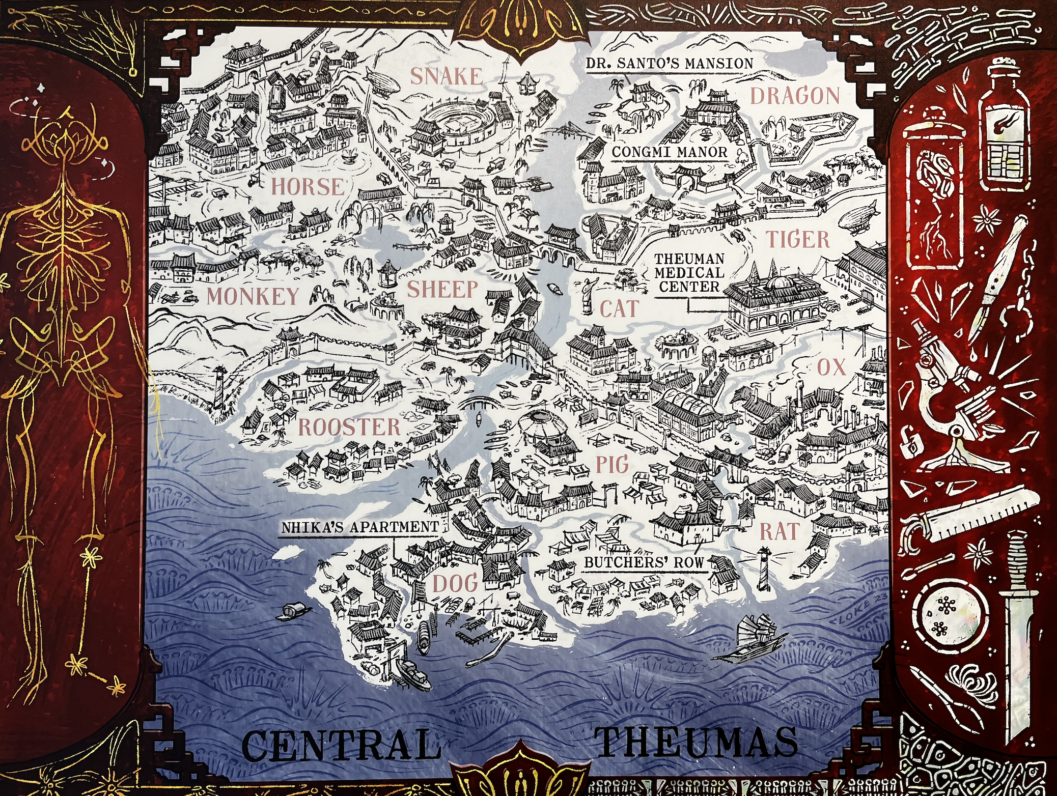 In a map made for The Last Bloodcarver, Loke draws out the story’s debate between modern and ancient forms of knowledge by labeling different districts with animals named in the Zodiac while painting the waves of surrounding water like double helix DNA. The setting is framed by medicinal adornments; knives, microscopes, cell nuclei, skeletons and swords exist side by side, establishing an aesthetic equality that bonds competing modes of information and philosophy.