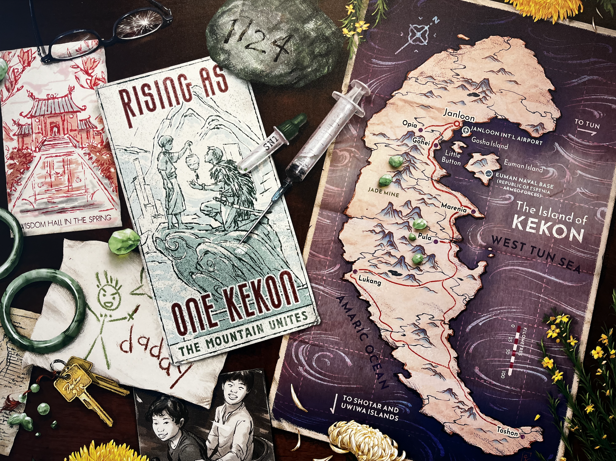 A special edition of Jade War includes a unique drawing by Loke: a map of the “Island of Kekon” is positioned on a desk, just one piece of paper contemplated among a host of other important objects: Postcards, pamphlets, a child’s drawing of “daddy,” car keys, photos, flecks of jade, a syringe, a chrystanthemum.