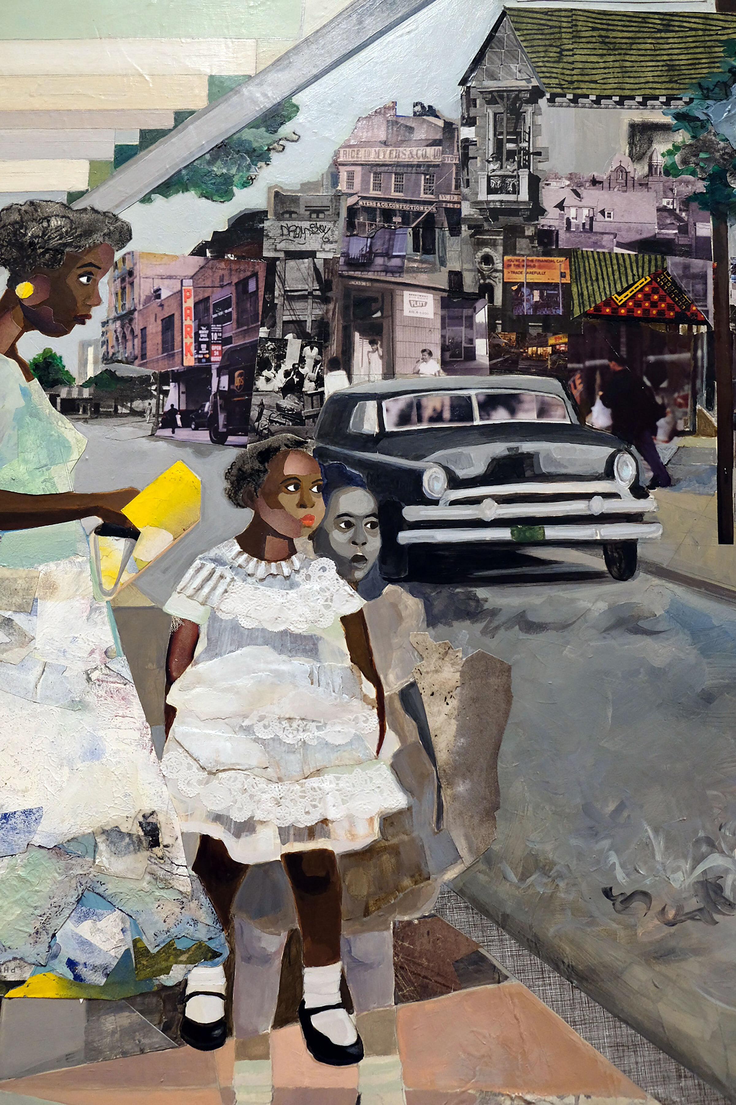 The first grouping of art explores architecture as an extension of the body, using buildings as metaphors for structural constraints and thoughts of freedom and containment. Of this grouping, I was particularly drawn to Chanda Méndrez-Ortiz ’05’s homage to Gordan Park’s 1956 photograph “Department Store, Mobile Alabama.” Méndrez-Ortiz uses found photographs of magazines and personal archives to offer layered narratives and uses scarring to symbolize trauma manifesting in a collective psyche.