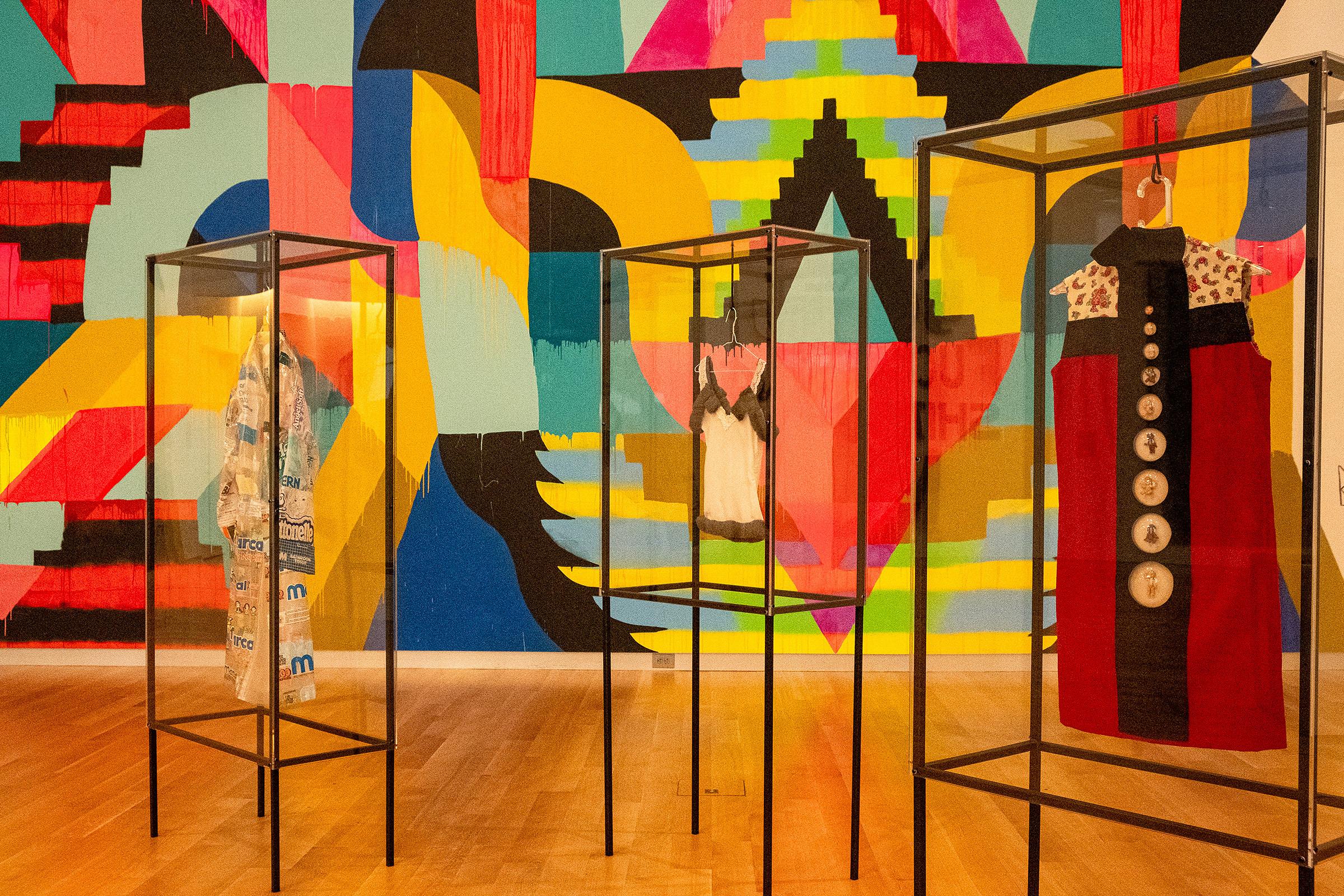 Mimi Smith ’63 reflects on gender biases and unpaid home/childcare laborers. “Steel Wool Camisole” combines lingerie and steel wool for scrubbing pots and pan. “Recycle Coats” is made out of wrapping from household items, which she says simultaneously protects and defines its wearer. “Nonpulets” features nine plastic babies in the coat, which Smith notes is a critique of the normalization of hyper-competitive approaches to the production of everything, including human life.
