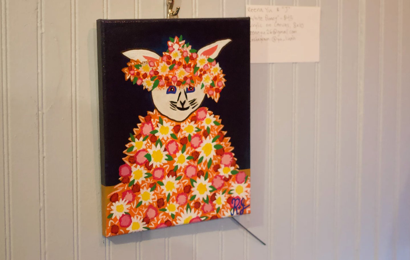 Inspired by the A24 horror flick Midsommar, she used her brush to dress the bunny up in an ominous May Queen adornment of flowers. “And bloodshot eyes, it didn’t have bloodshot eyes before.”