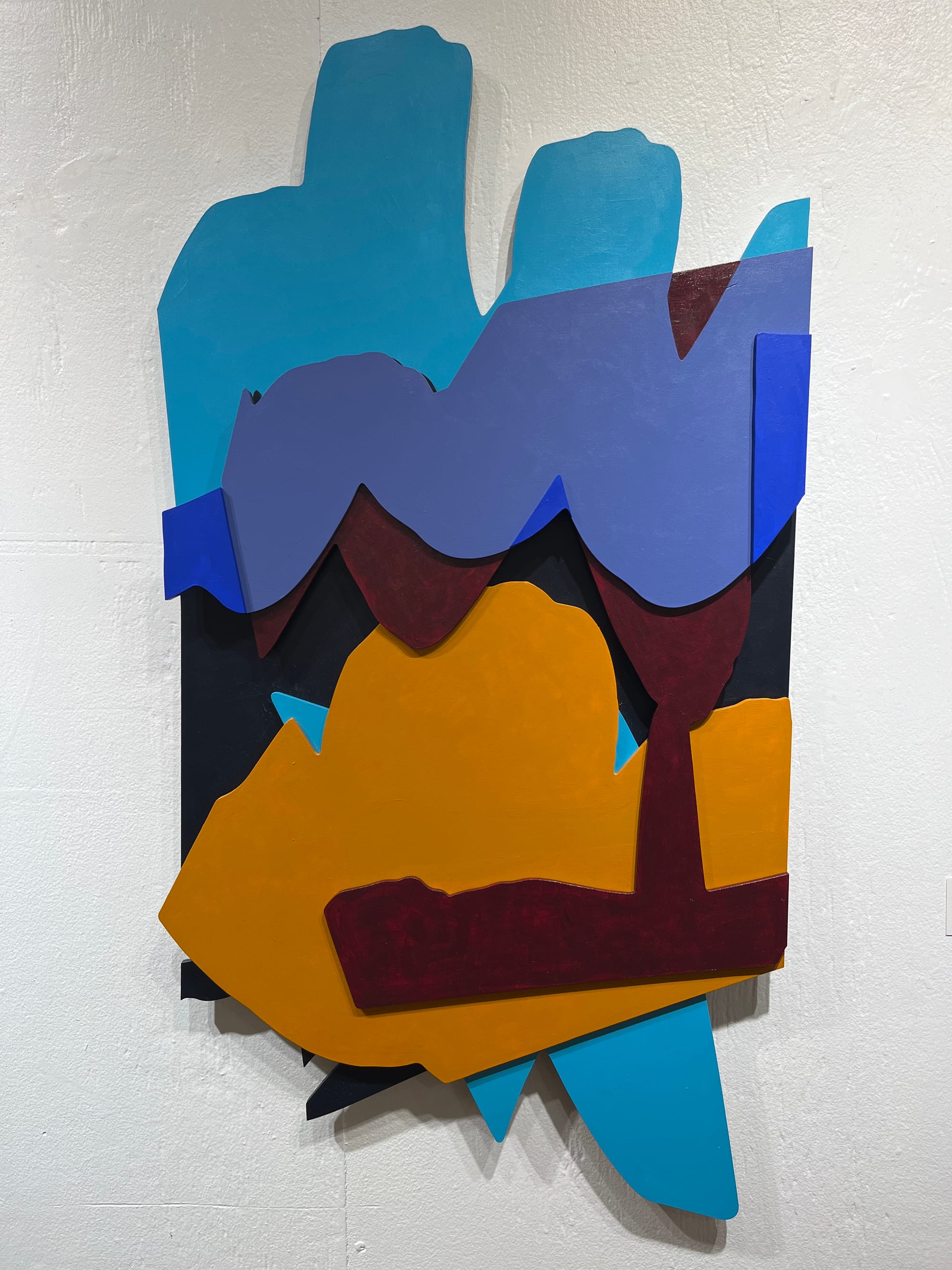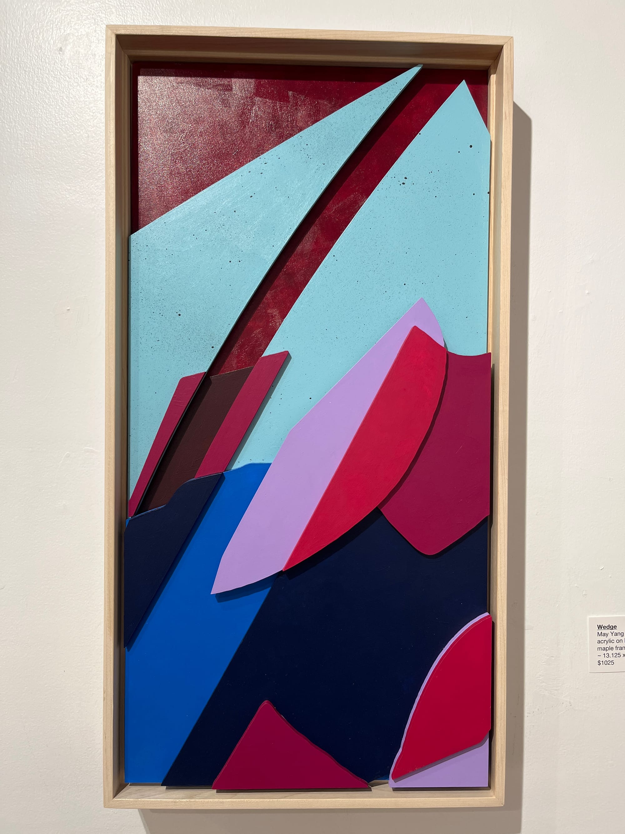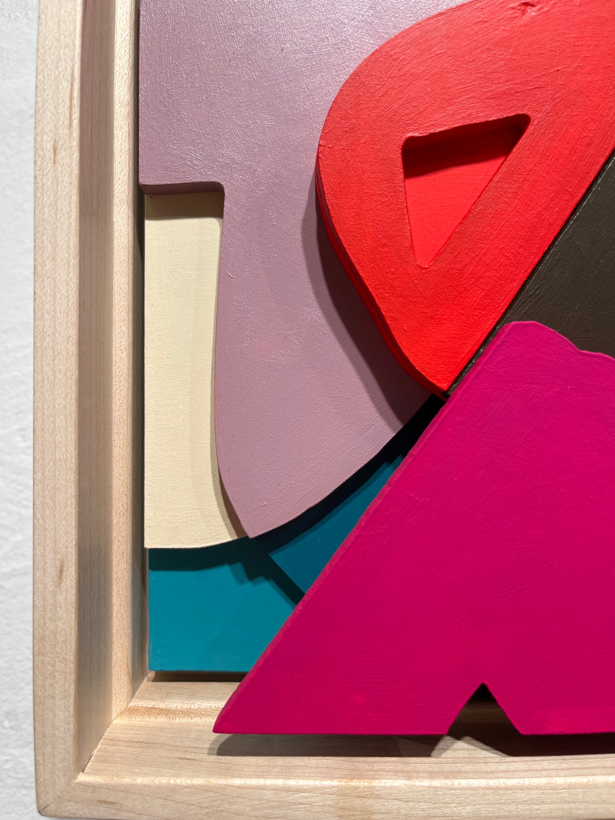 The whole show unfolds like a train of thought expressed not verbally but physically. “Wordplay” starts to the right of the gallery door with a small box filled with unpainted fibreboard shapes, almost like a children’s puzzle. Next to it, the only flat painting in the exhibit (The Tide Will Turn) sets up another stage in Yang’s own development; her flat paintings, she told me, “always wanted to be dimensional.” I can almost feel the phrasing of the painting’s title here, the rhythm of a wave in the stroke of pink and the shifts between dark and bright. Beside this piece hangs After Image, which seems to take elements from its 2-D neighbor and pop them off each other—and we’re off and running as Yang states her new process with authority.