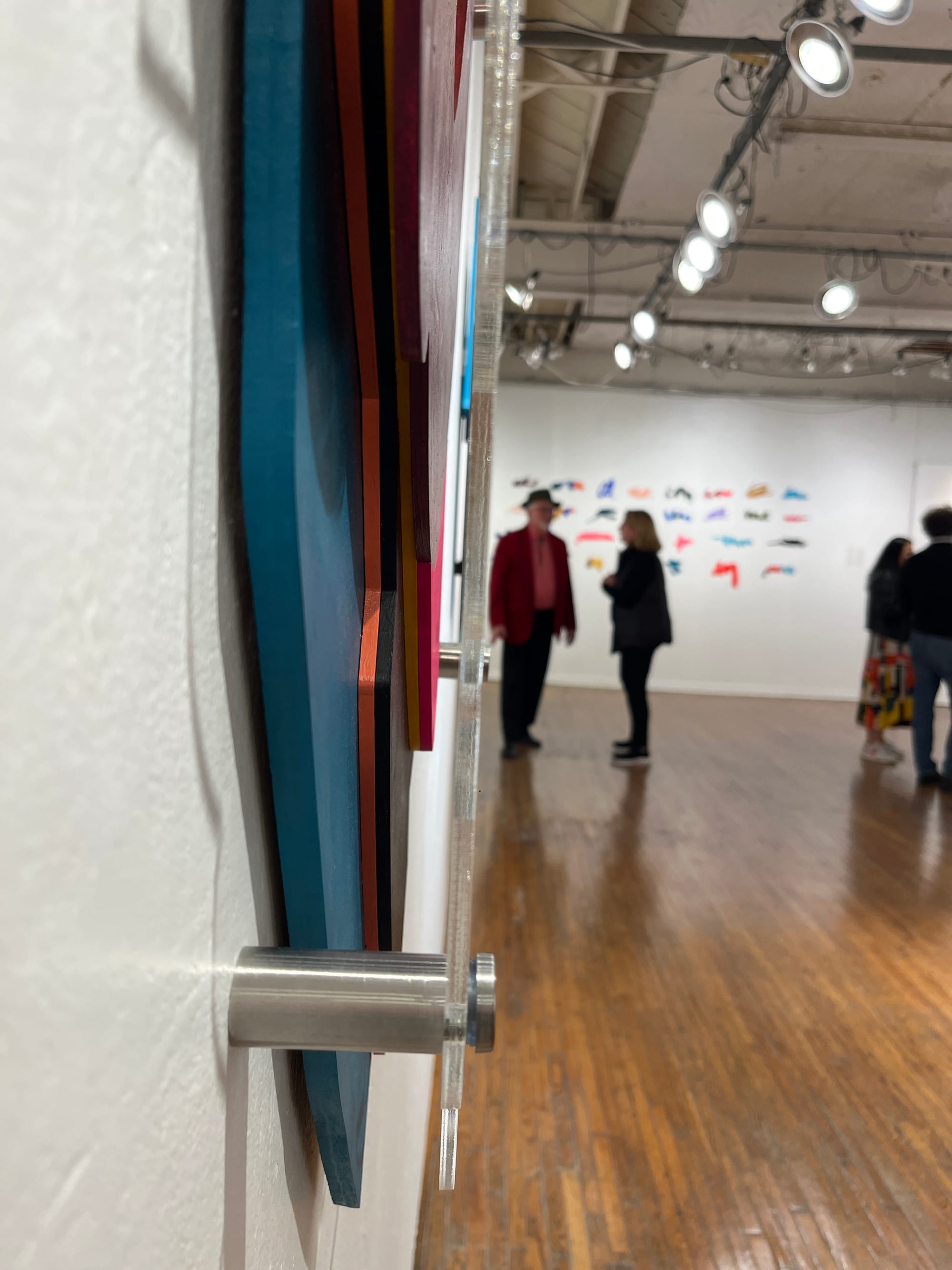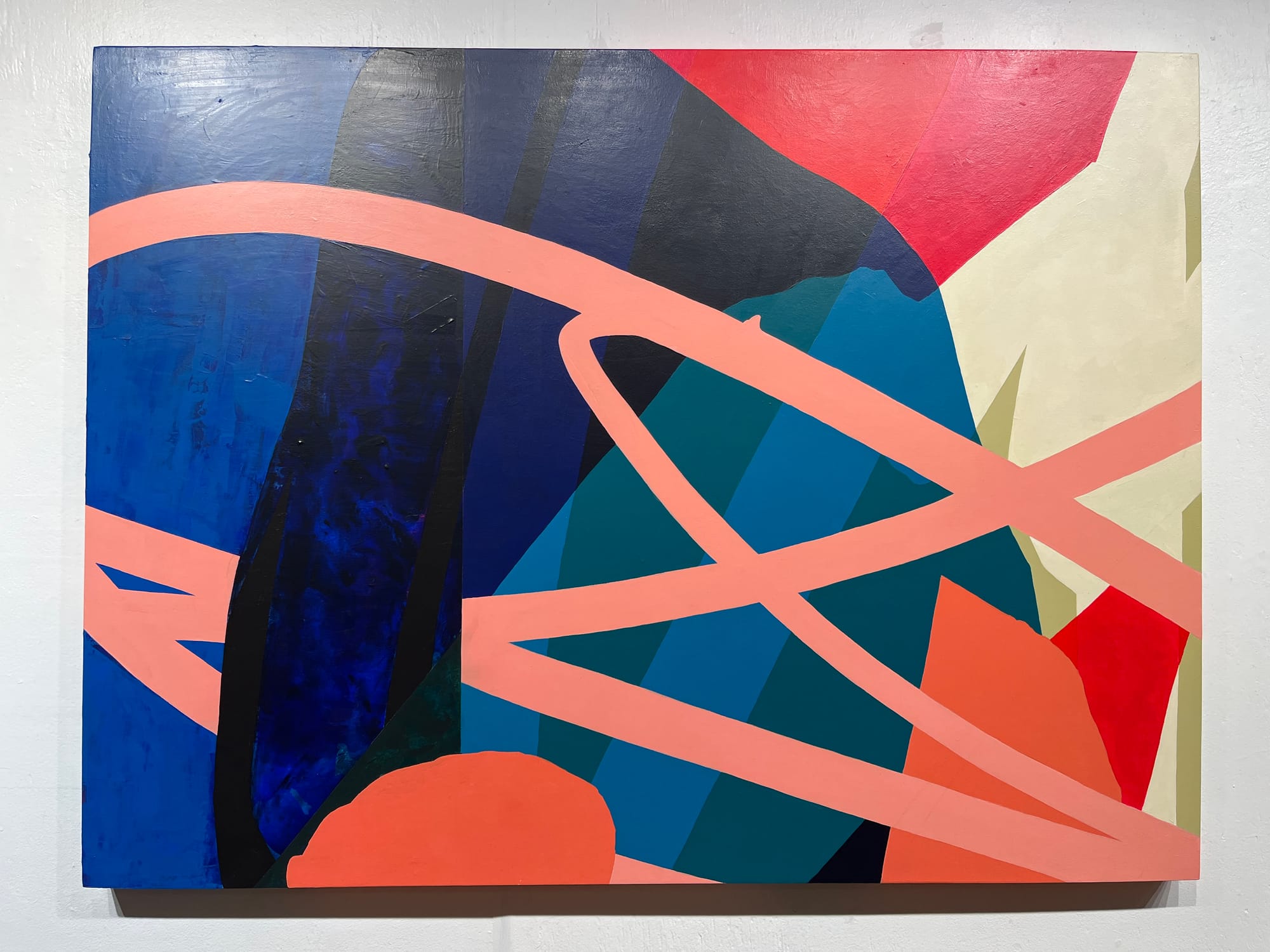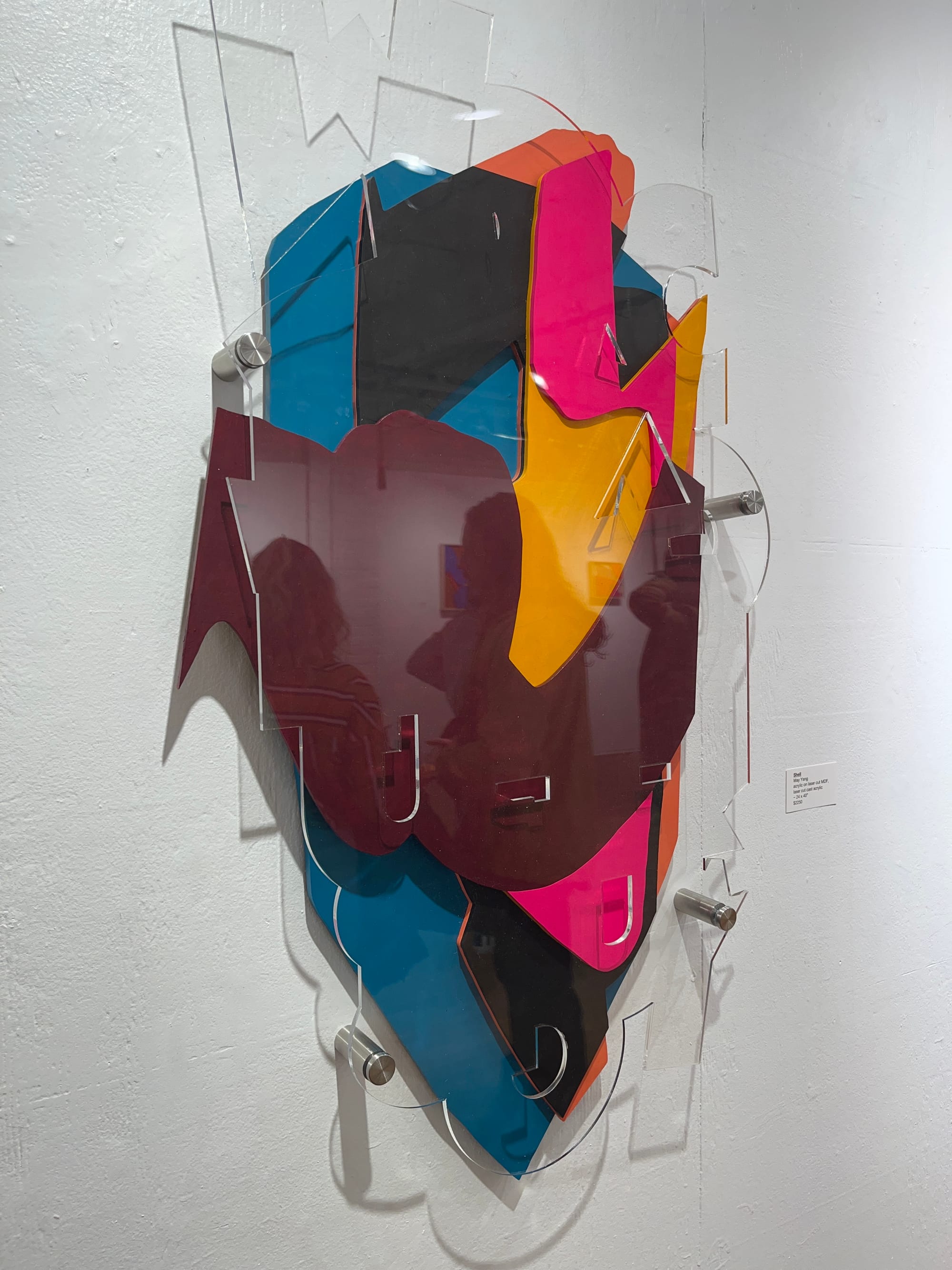 The whole show unfolds like a train of thought expressed not verbally but physically. “Wordplay” starts to the right of the gallery door with a small box filled with unpainted fibreboard shapes, almost like a children’s puzzle. Next to it, the only flat painting in the exhibit (The Tide Will Turn) sets up another stage in Yang’s own development; her flat paintings, she told me, “always wanted to be dimensional.” I can almost feel the phrasing of the painting’s title here, the rhythm of a wave in the stroke of pink and the shifts between dark and bright. Beside this piece hangs After Image, which seems to take elements from its 2-D neighbor and pop them off each other—and we’re off and running as Yang states her new process with authority.