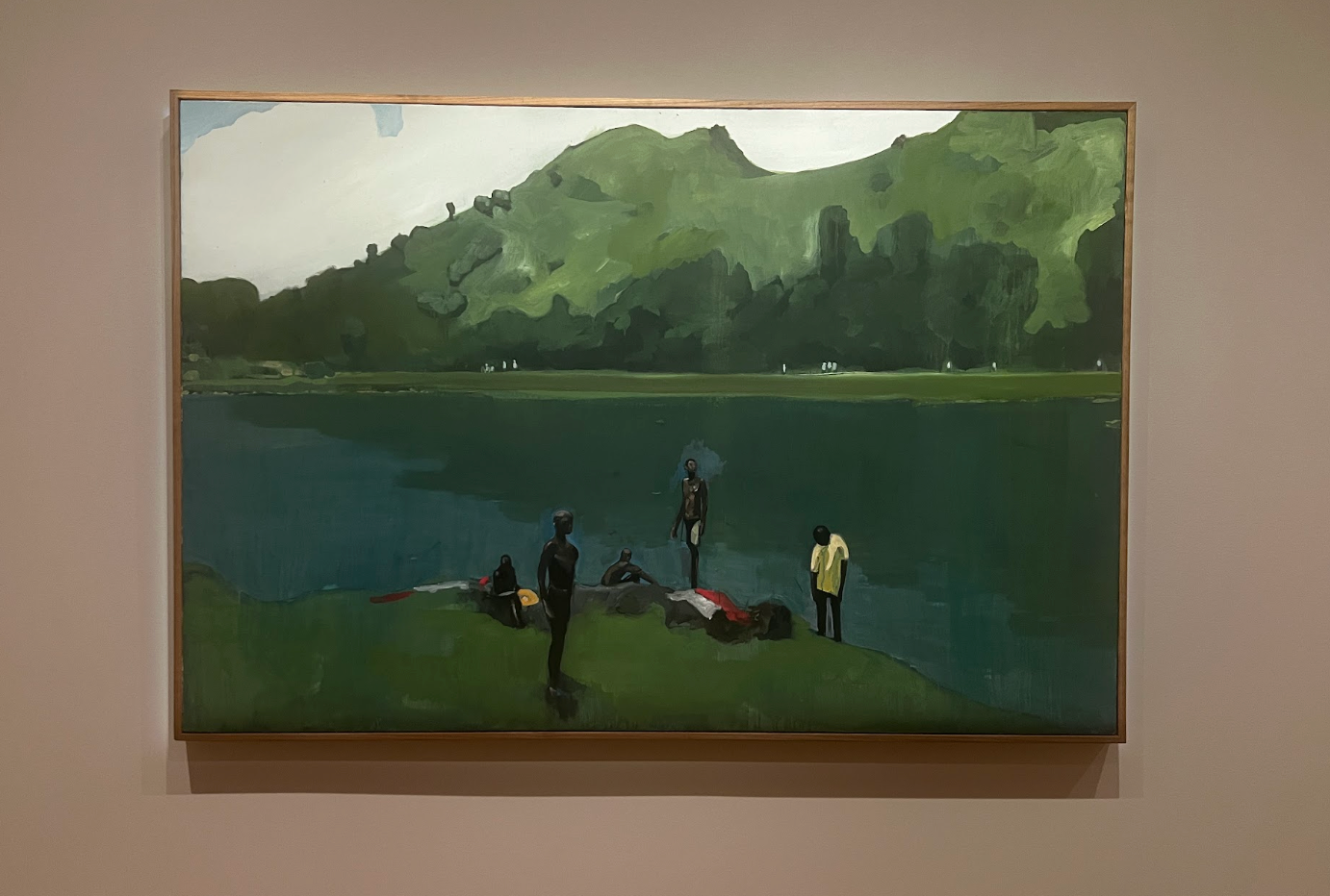 As I’m focused on the individual in the lower right painted into a yellow shirt — who seemed oblivious to the happenings around him — someone in the workshop pointed out some forms on the opposite side of the body of water, dubbing them spiritual entities potentially keeping watch over this group of young men.