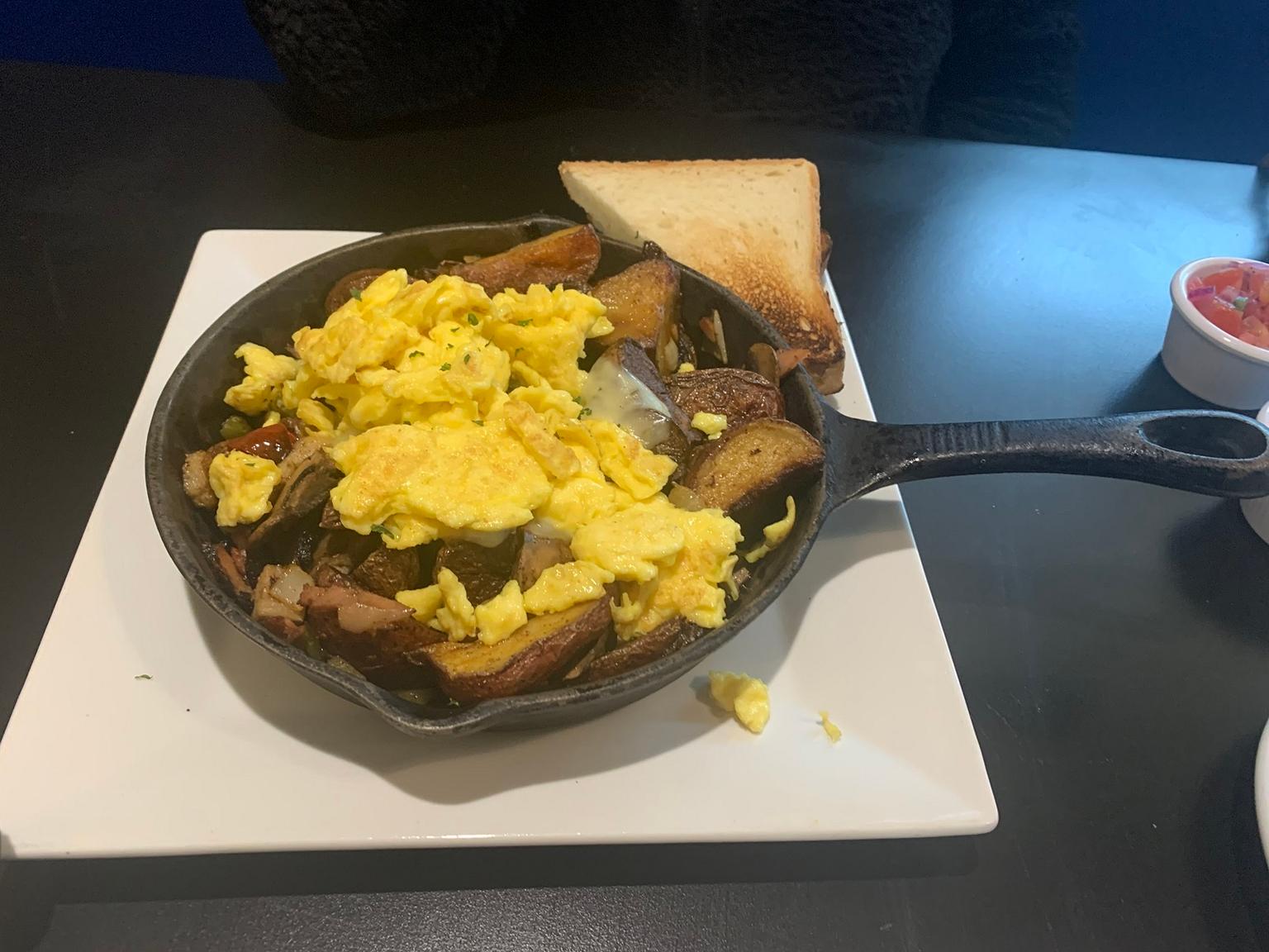 I tried some of the Blue Plate’s special home-fry bowls, settling on the Kitchen Sink Skillet which, as the name implies, comes with everything but: home fries topped with scrambled eggs, sausage, ham, peppers, tomatoes, onions, mushrooms, Monterey Jack cheese, bacon and toast.